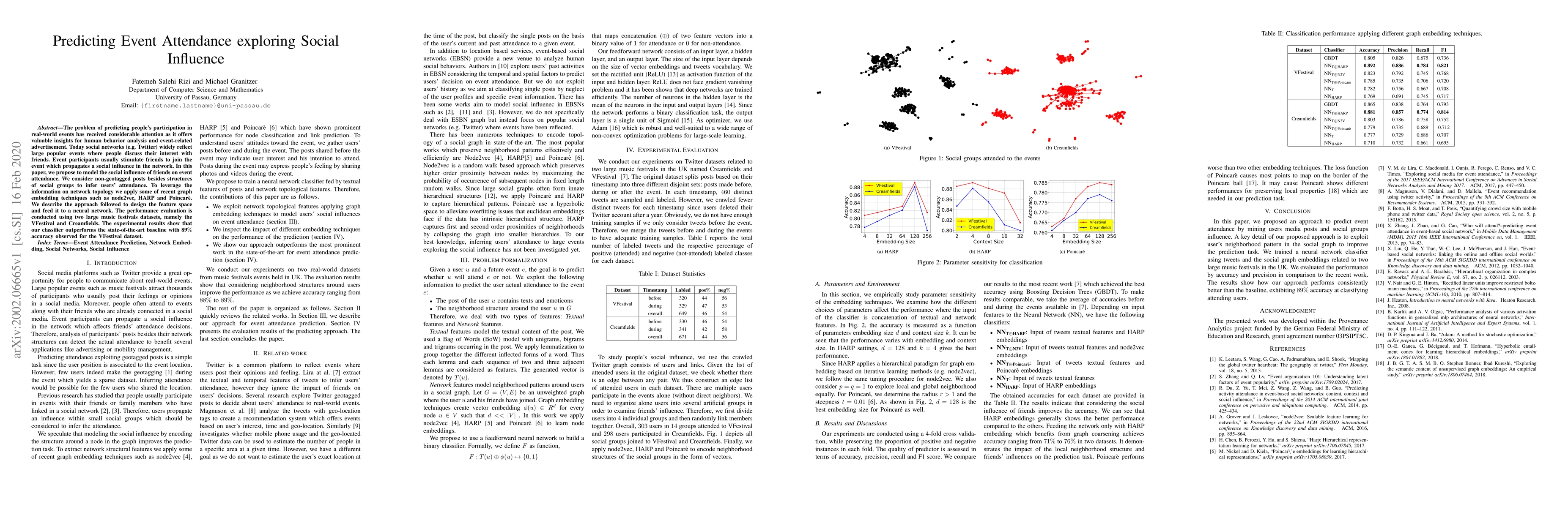 The problem of predicting people's participation in real-world events has received considerable attention as it offers valuable insights for human behavior analysis and event-related advertisement. Today social networks (e.g. Twitter) widely reflect large popular events where people discuss their interest with friends. Event participants usually stimulate friends to join the event which propagates a social influence in the network. In this paper, we propose to model the social influence of friends on event attendance. We consider non-geotagged posts besides structures of social groups to infer users' attendance. To leverage the information on network topology we apply some of recent graph embedding techniques such as node2vec, HARP and Poincar`e. We describe the approach followed to design the feature space and feed it to a neural network. The performance evaluation is conducted using two large music festivals datasets, namely the VFestival and Creamfields. The experimental results show that our classifier outperforms the state-of-the-art baseline with 89% accuracy observed for the VFestival dataset.