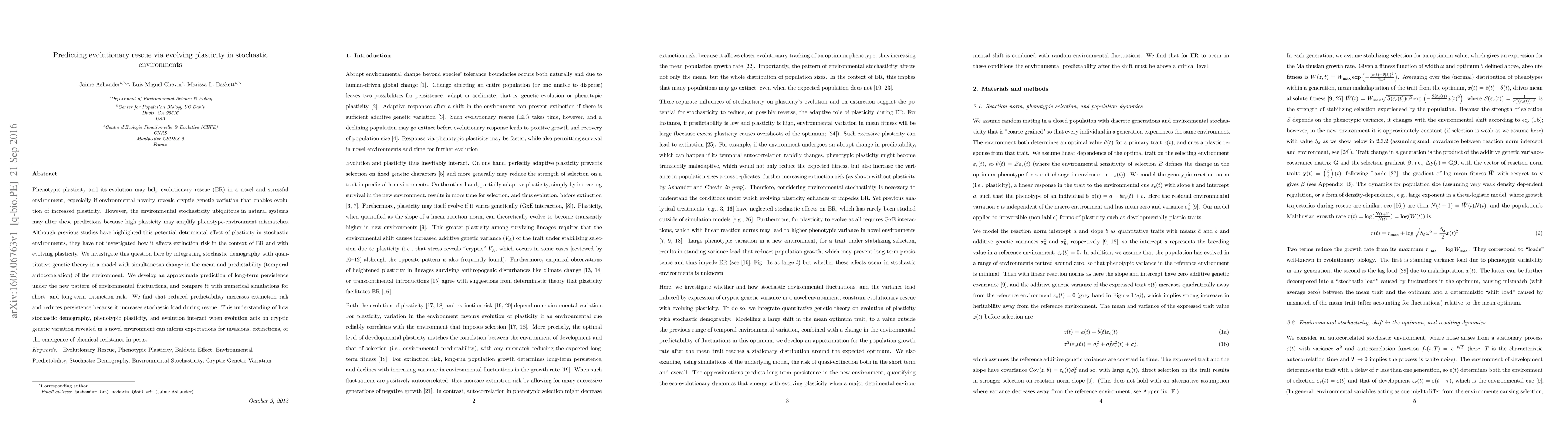 This paper explores how evolving phenotypic plasticity can aid evolutionary rescue in stochastic environments, finding that reduced environmental predictability increases extinction risk by amplifying stochastic load during rescue. The study integrates stochastic demography and quantitative genetics to predict long-term persistence and compares it with numerical simulations.