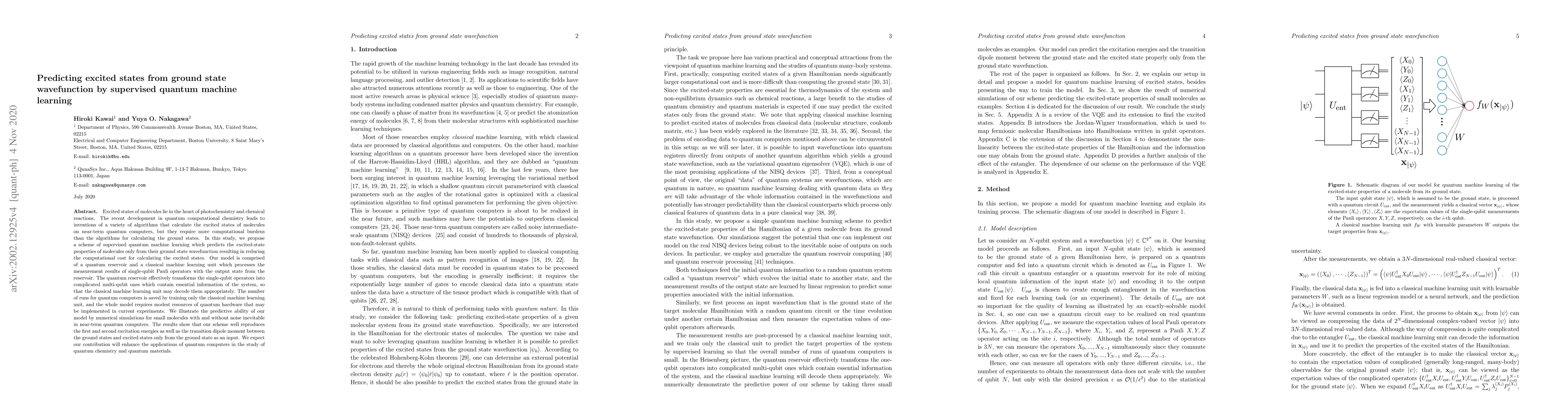 Excited states of molecules lie in the heart of photochemistry and chemical reactions. The recent development in quantum computational chemistry leads to inventions of a variety of algorithms that calculate the excited states of molecules on near-term quantum computers, but they require more computational burdens than the algorithms for calculating the ground states. In this study, we propose a scheme of supervised quantum machine learning which predicts the excited-state properties of molecules only from their ground state wavefunction resulting in reducing the computational cost for calculating the excited states. Our model is comprised of a quantum reservoir and a classical machine learning unit which processes the measurement results of single-qubit Pauli operators with the output state from the reservoir. The quantum reservoir effectively transforms the single-qubit operators into complicated multi-qubit ones which contain essential information of the system, so that the classical machine learning unit may decode them appropriately. The number of runs for quantum computers is saved by training only the classical machine learning unit, and the whole model requires modest resources of quantum hardware that may be implemented in current experiments. We illustrate the predictive ability of our model by numerical simulations for small molecules with and without noise inevitable in near-term quantum computers. The results show that our scheme well reproduces the first and second excitation energies as well as the transition dipole moment between the ground states and excited states only from the ground state as an input. We expect our contribution will enhance the applications of quantum computers in the study of quantum chemistry and quantum materials.
