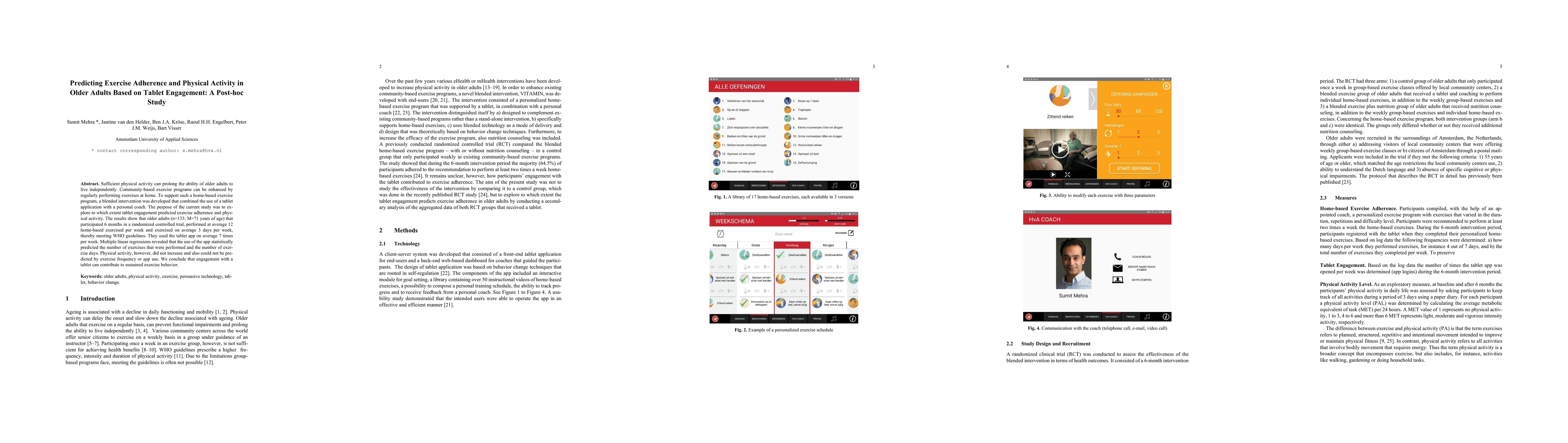 Sufficient physical activity can prolong the ability of older adults to live inde-pendently. Community-based exercise programs can be enhanced by regularly performing exercises at home. To support such a home-based exercise program, a blended intervention was developed that combined the use of a tablet application with a personal coach. The purpose of the current study was to explore to which extent tablet engagement predicted exercise adherence and physical activity. The results show that older adults (n=133; M=71 years of age) that participated 6 months in a randomized controlled trial, performed at average 12 home-based ex-ercised per week and exercised on average 3 days per week, thereby meeting WHO guidelines. They used the tablet app on average 7 times per week. Multiple linear regressions revealed that the use of the app statistically predicted the num-ber of exercises that were performed and the number of exercise days. Physical activity, however, did not increase and also could not be predicted by exercise frequency or app use. We conclude that engagement with a tablet can contribute to sustained exercise behavior.