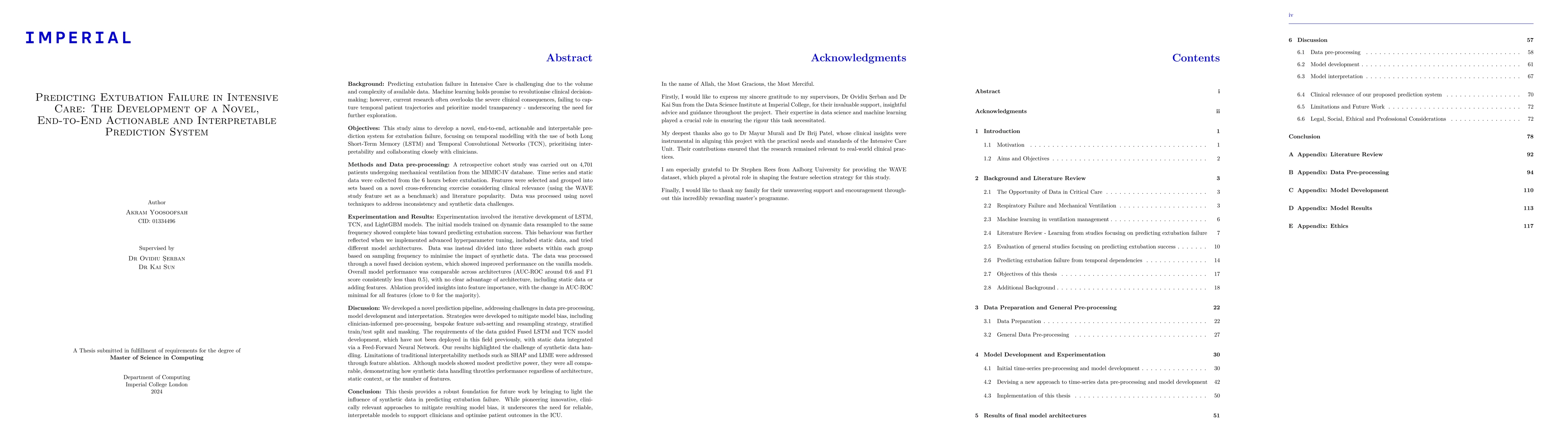 Predicting extubation failure in intensive care is challenging due to complex data and the severe consequences of inaccurate predictions. Machine learning shows promise in improving clinical decision-making but often fails to account for temporal patient trajectories and model interpretability, highlighting the need for innovative solutions. This study aimed to develop an actionable, interpretable prediction system for extubation failure using temporal modelling approaches such as Long Short-Term Memory (LSTM) and Temporal Convolutional Networks (TCN). A retrospective cohort study of 4,701 mechanically ventilated patients from the MIMIC-IV database was conducted. Data from the 6 hours before extubation, including static and dynamic features, were processed through novel techniques addressing data inconsistency and synthetic data challenges. Feature selection was guided by clinical relevance and literature benchmarks. Iterative experimentation involved training LSTM, TCN, and LightGBM models. Initial results showed a strong bias toward predicting extubation success, despite advanced hyperparameter tuning and static data inclusion. Data was stratified by sampling frequency to reduce synthetic data impacts, leading to a fused decision system with improved performance. However, all architectures yielded modest predictive power (AUC-ROC ~0.6; F1 <0.5) with no clear advantage in incorporating static data or additional features. Ablation analysis indicated minimal impact of individual features on model performance. This thesis highlights the challenges of synthetic data in extubation failure prediction and introduces strategies to mitigate bias, including clinician-informed preprocessing and novel feature subsetting. While performance was limited, the study provides a foundation for future work, emphasising the need for reliable, interpretable models to optimise ICU outcomes.