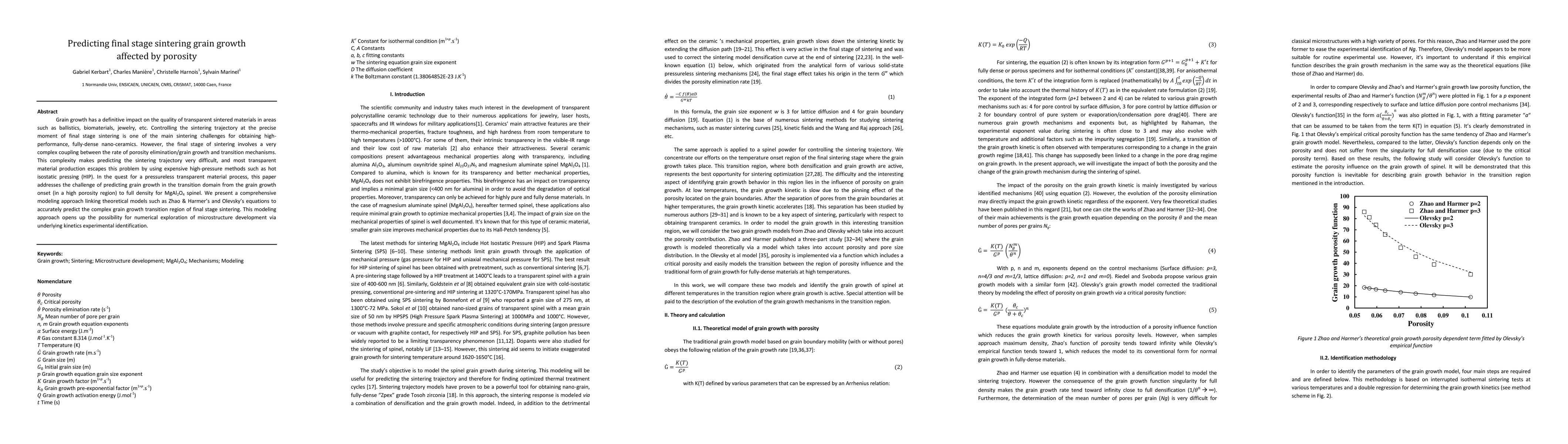 Grain growth has a definitive impact on the quality of transparent sintered materials in areas such as ballistics, biomaterials, jewelry, etc. Controlling the sintering trajectory at the precise moment of final stage sintering is one of the main sintering challenges for obtaining highperformance, fully-dense nano-ceramics. However, the final stage of sintering involves a very complex coupling between the rate of porosity elimination/grain growth and transition mechanisms. This complexity makes predicting the sintering trajectory very difficult, and most transparent material production escapes this problem by using expensive high-pressure methods such as hot isostatic pressing (HIP). In the quest for a pressureless transparent material process, this paper addresses the challenge of predicting grain growth in the transition domain from the grain growth onset (in a high porosity region) to full density for MgAl 2 O 4 spinel. We present a comprehensive modeling approach linking theoretical models such as Zhao \& Harmer's and Olevsky's equations to accurately predict the complex grain growth transition region of final stage sintering. This modeling approach opens up the possibility for numerical exploration of microstructure development via underlying kinetics experimental identification.