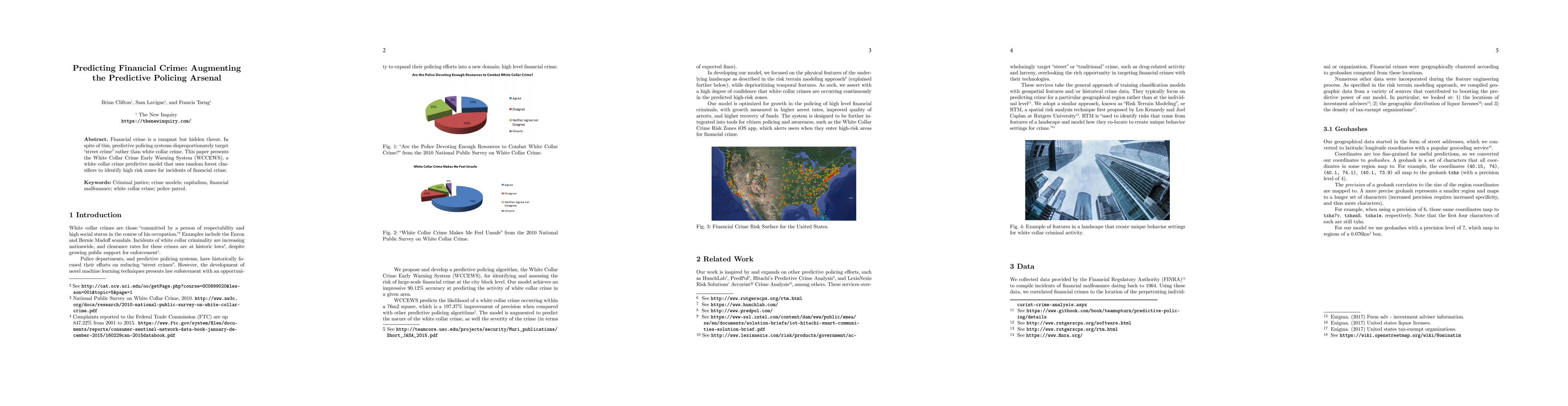 This paper introduces the White Collar Crime Early Warning System (WCCEWS), a predictive model utilizing random forest classifiers to identify high-risk areas for financial crime, aiming to augment predictive policing beyond street crime. The model seeks to address the under-prioritization of white-collar crime in predictive policing systems.