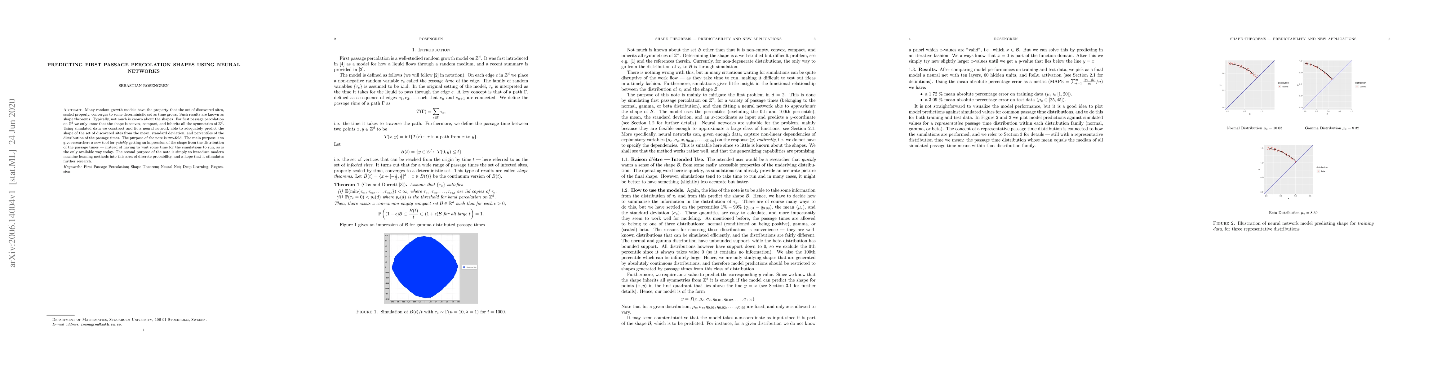 This paper introduces a neural network model that predicts the shape of discovered sites in first passage percolation on (mathbb{Z}^d) using statistical measures of passage times. The method offers a faster alternative to traditional simulation-based approaches, aiming to facilitate researchers' understanding of shape theorems in random growth models.