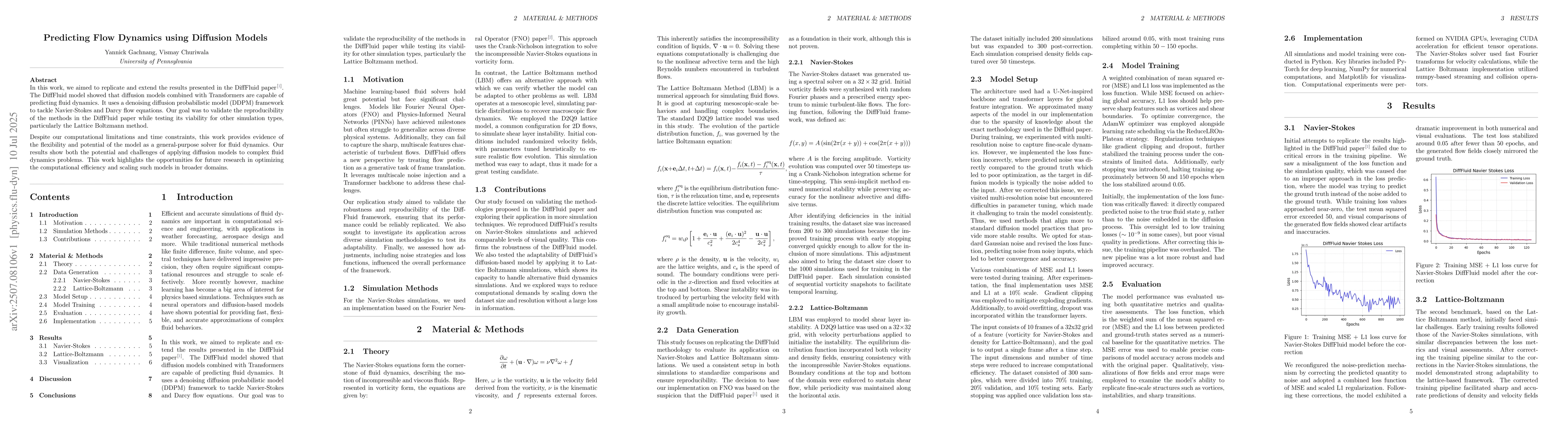 This study aimed to replicate and extend the results of the DiffFluid paper by applying diffusion models combined with Transformers to predict fluid dynamics, specifically focusing on Navier-Stokes and Lattice Boltzmann methods. The research utilized a U-Net-inspired backbone with Transformer layers for feature integration, employing a DDPM framework. They corrected issues in the training pipeline, adopting a standard Gaussian noise approach and revising the loss function for better convergence and accuracy.