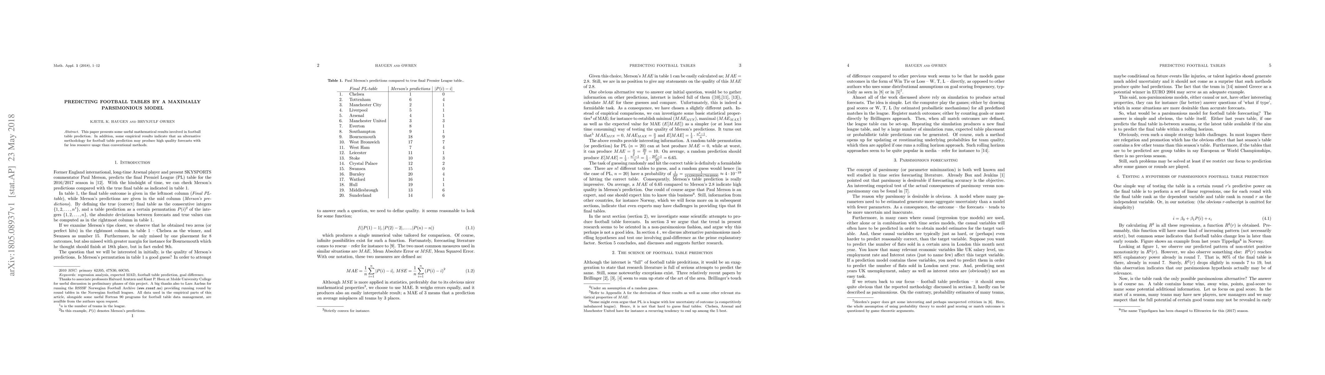 This paper presents some useful mathematical results involved in football table prediction. In addition, some empirical results indicate that an alternative methodology for football table prediction may produce high quality forecasts with far less resource usage than conventional methods.