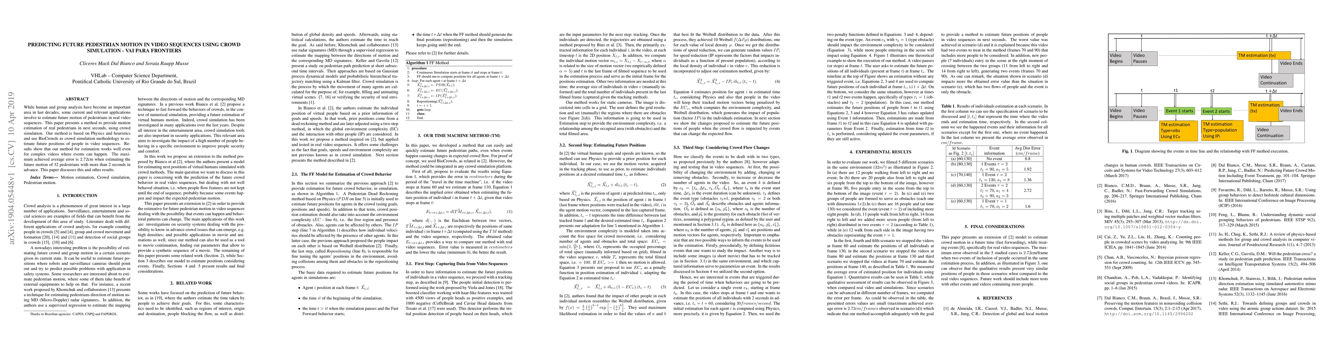 This paper proposes a method to predict future pedestrian motion in video sequences using crowd simulation based on physics and heuristics, with BioCrowds as the simulation methodology. The method achieves an average error of $2.72$cm in estimating pedestrian positions up to 2 seconds in advance, even in complex scenarios.
