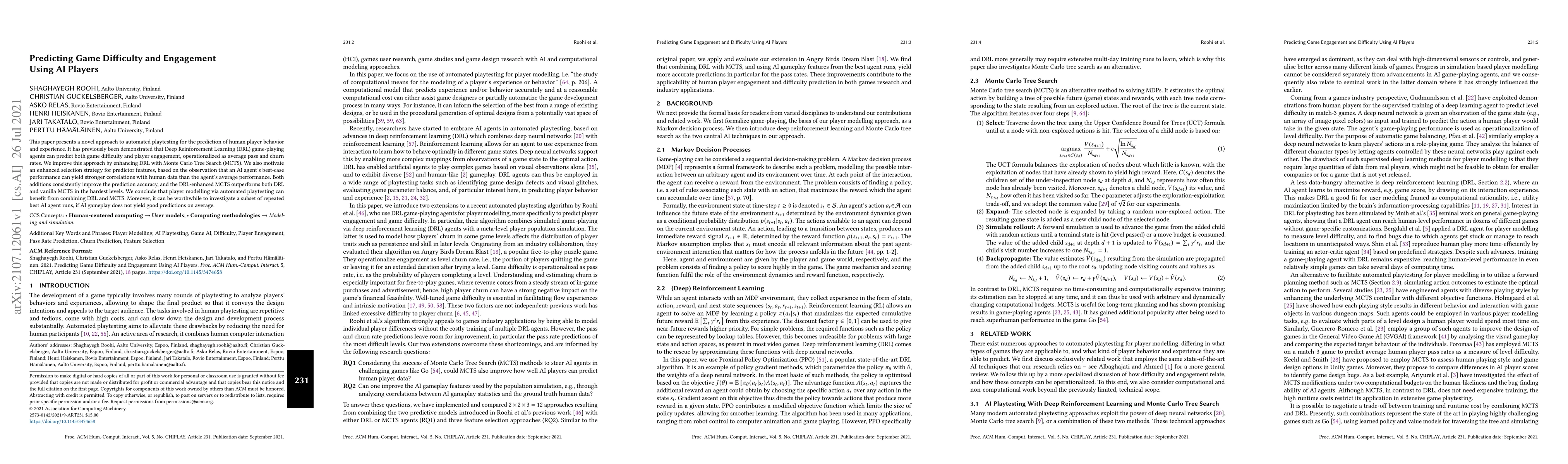 This paper combines Deep Reinforcement Learning (DRL) and Monte Carlo Tree Search (MCTS) to enhance automated playtesting for predicting human player engagement and difficulty, showing improved prediction accuracy. Best-case AI performance correlates better with human data than average performance.