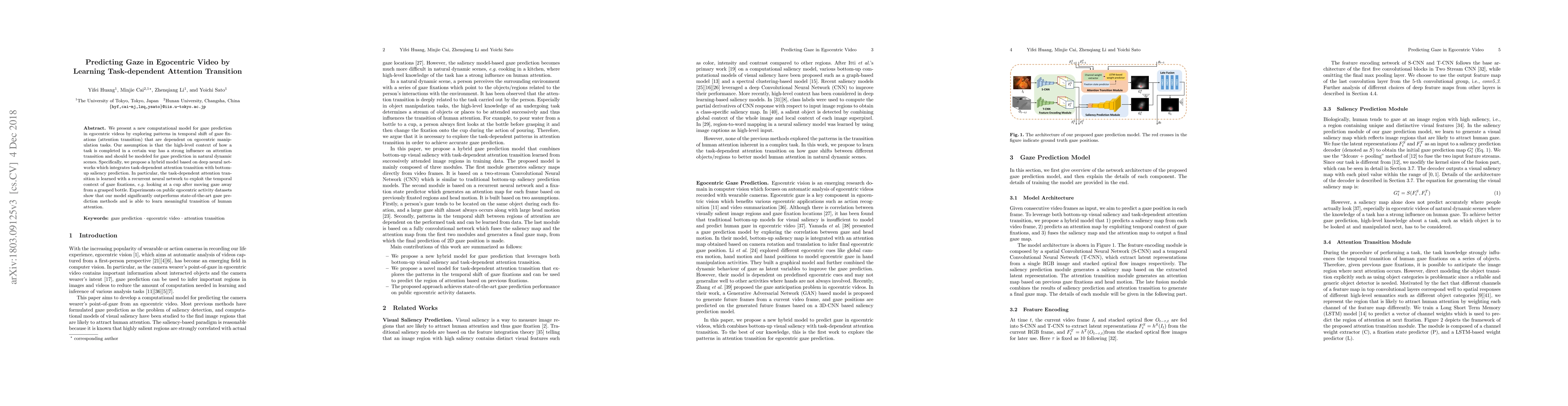 This paper introduces a hybrid model for predicting gaze in egocentric videos using task-dependent attention transitions. The model combines deep neural networks with recurrent networks to capture temporal context, significantly outperforming existing methods in gaze prediction.