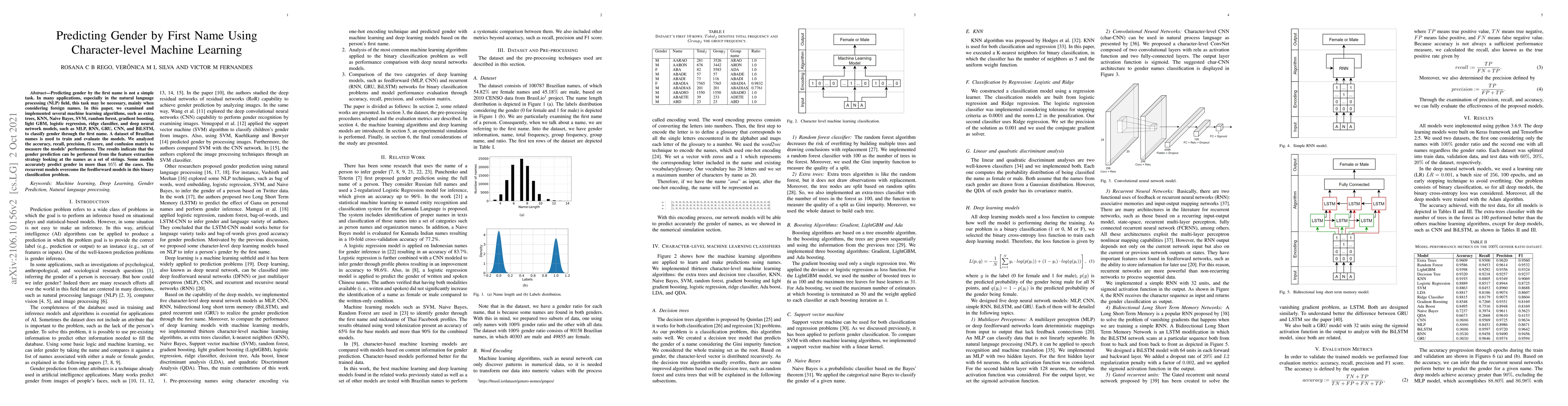 This paper explores various machine learning and deep learning algorithms to predict gender from first names, using a dataset of Brazilian names. Recurrent neural network models, such as RNN and GRU, outperform other methods, achieving over 95% accuracy in gender prediction.