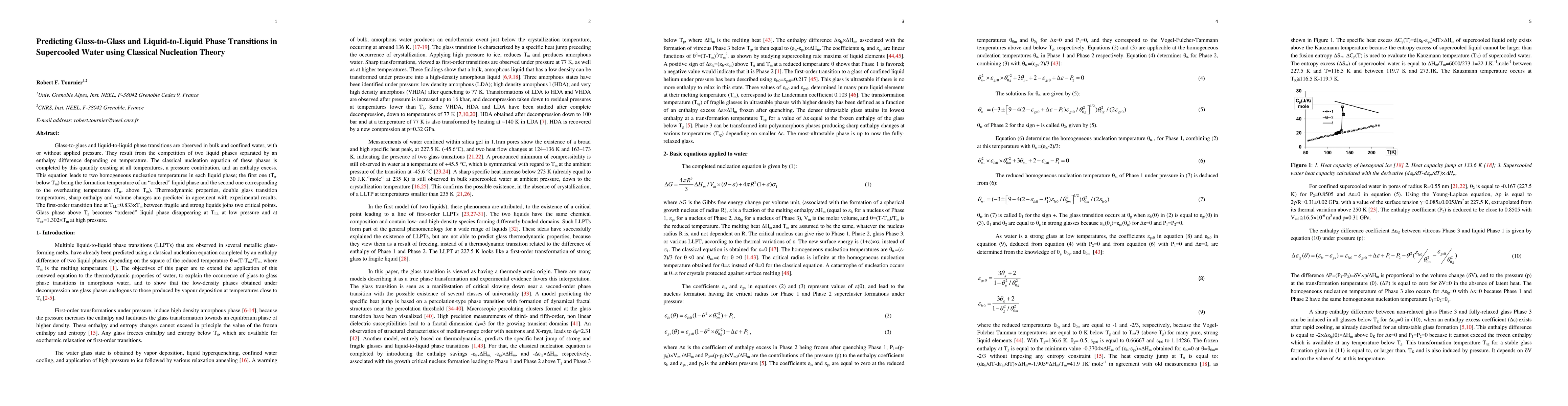 Glass-to-glass and liquid-to-liquid phase transitions are observed in bulk and confined water, with or without applied pressure. They result from the competition of two liquid phases separated by an enthalpy difference depending on temperature. The classical nucleation equation of these phases is completed by this quantity existing at all temperatures, a pressure contribution, and an enthalpy excess. This equation leads to two homogeneous nucleation temperatures in each liquid phase, the first one being the formation temperature of an ordered liquid phase below the melting temperature and the second one corresponding to the overheating temperature. Thermodynamic properties, double glass transition temperatures, sharp enthalpy and volume changes are predicted in agreement with experimental results. The first-order transition line between fragile and strong liquids joins two critical points. Glass phase above its transition temperature becomes ordered liquid phase disappearing at a first-order transition temperature at low pressure and at a temperature larger than the melting temperature at high pressure.