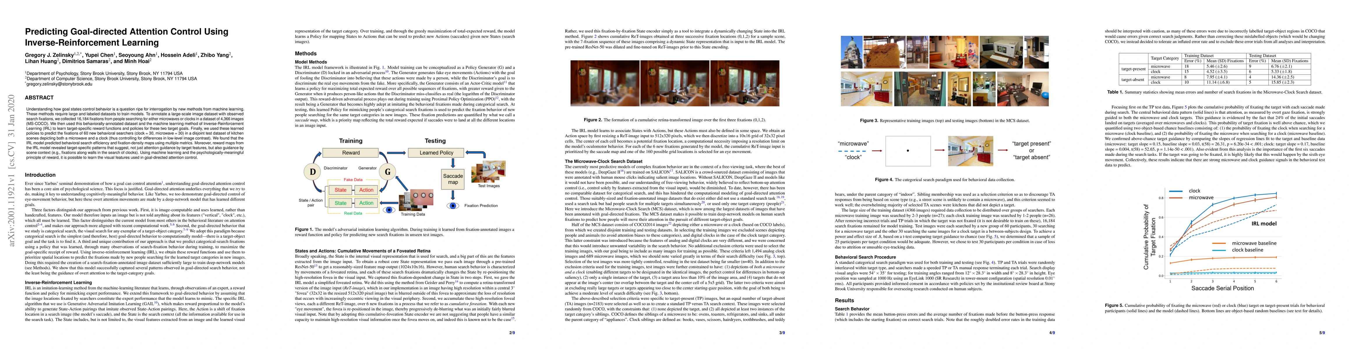 This research uses Inverse-Reinforcement Learning (IRL) to predict goal-directed attention control by training on a dataset of human search fixations for microwaves and clocks. The IRL model successfully predicts search efficiency and fixation patterns, indicating that it captures both target-specific features and contextual scene information.