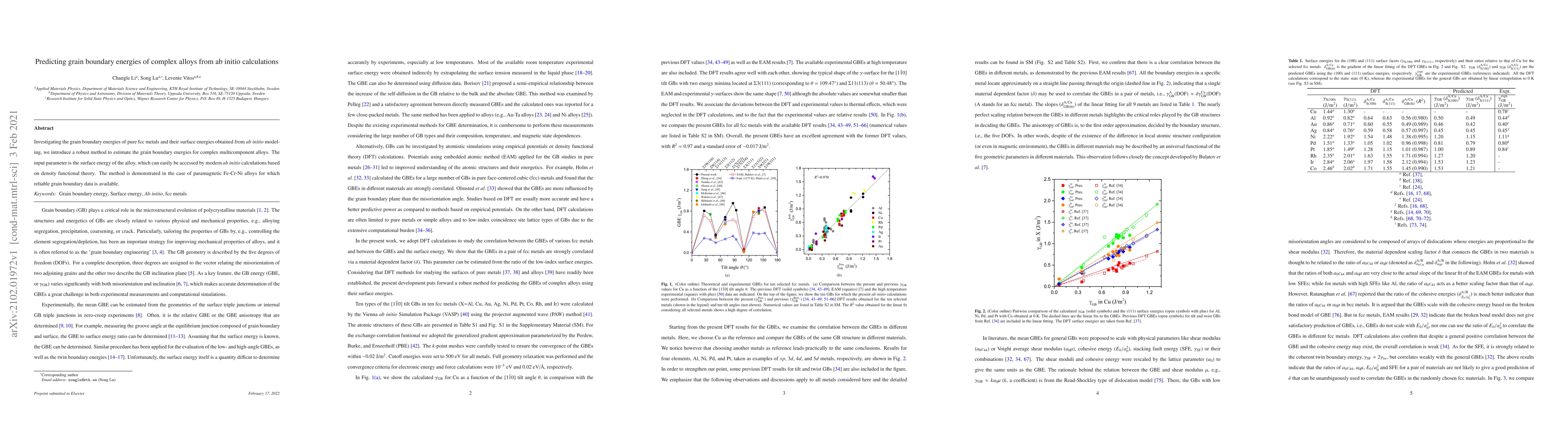 This paper introduces a method for predicting grain boundary energies in complex multicomponent alloys using ab initio calculations, specifically leveraging surface energy data obtained from density functional theory. The method is exemplified through the analysis of paramagnetic Fe-Cr-Ni alloys with available grain boundary data.