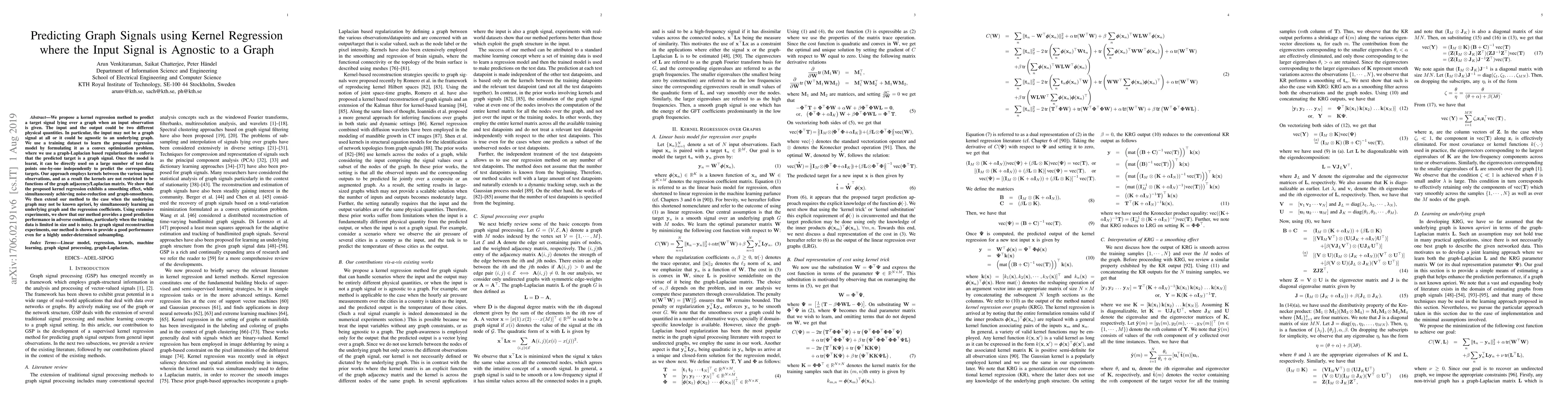 This paper proposes a kernel regression method to predict graph signals from input signals that may not be graph-related, employing a training dataset and a convex optimization problem with graph-Laplacian regularization. The method achieves noise reduction and graph smoothness, and extends to cases where the underlying graph is unknown, demonstrating good performance in limited and noisy data conditions.