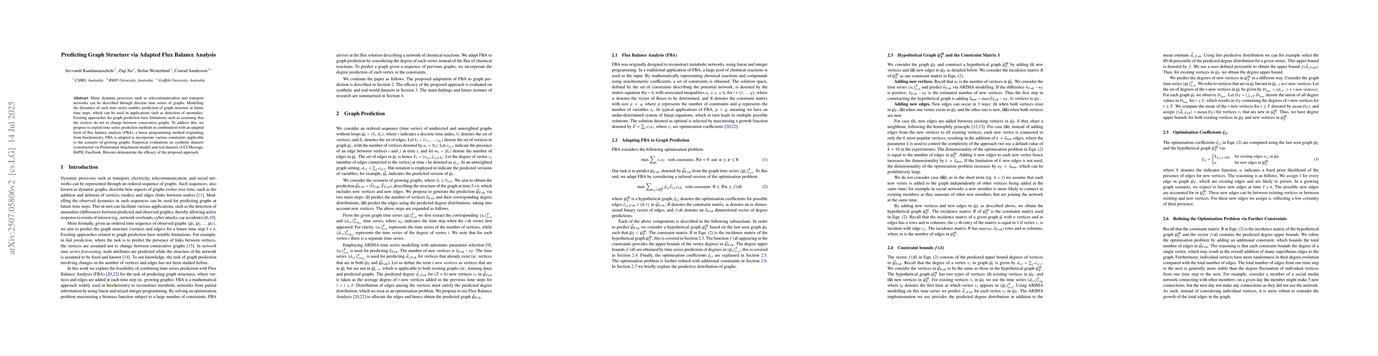 Many dynamic processes such as telecommunication and transport networks can be described through discrete time series of graphs. Modelling the dynamics of such time series enables prediction of graph structure at future time steps, which can be used in applications such as detection of anomalies. Existing approaches for graph prediction have limitations such as assuming that the vertices do not to change between consecutive graphs. To address this, we propose to exploit time series prediction methods in combination with an adapted form of flux balance analysis (FBA), a linear programming method originating from biochemistry. FBA is adapted to incorporate various constraints applicable to the scenario of growing graphs. Empirical evaluations on synthetic datasets (constructed via Preferential Attachment model) and real datasets (UCI Message, HePH, Facebook, Bitcoin) demonstrate the efficacy of the proposed approach.