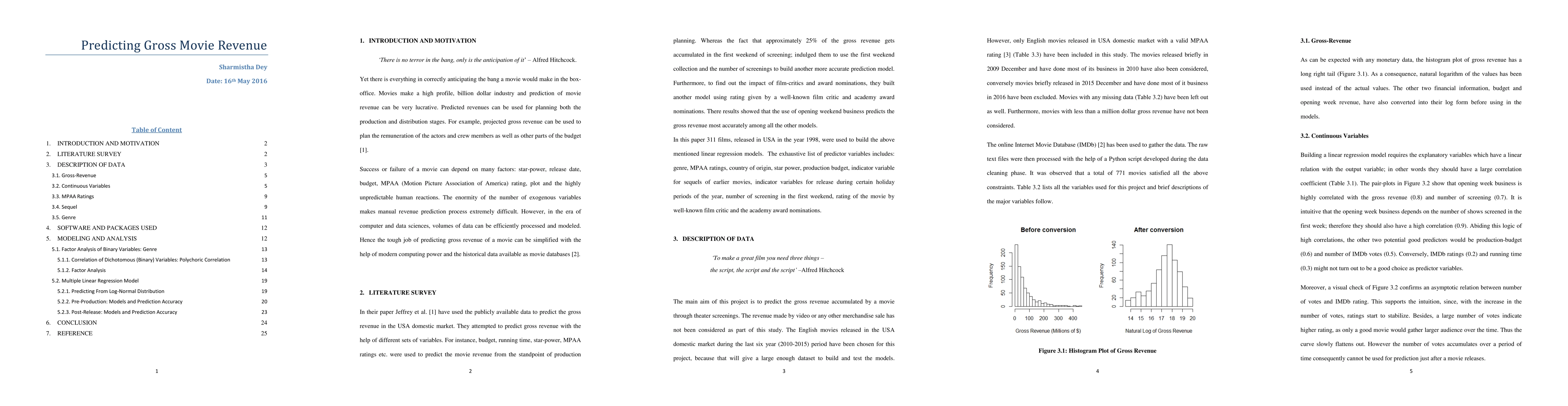 'There is no terror in the bang, only is the anticipation of it' - Alfred Hitchcock. Yet there is everything in correctly anticipating the bang a movie would make in the box-office. Movies make a high profile, billion dollar industry and prediction of movie revenue can be very lucrative. Predicted revenues can be used for planning both the production and distribution stages. For example, projected gross revenue can be used to plan the remuneration of the actors and crew members as well as other parts of the budget [1]. Success or failure of a movie can depend on many factors: star-power, release date, budget, MPAA (Motion Picture Association of America) rating, plot and the highly unpredictable human reactions. The enormity of the number of exogenous variables makes manual revenue prediction process extremely difficult. However, in the era of computer and data sciences, volumes of data can be efficiently processed and modelled. Hence the tough job of predicting gross revenue of a movie can be simplified with the help of modern computing power and the historical data available as movie databases [2].