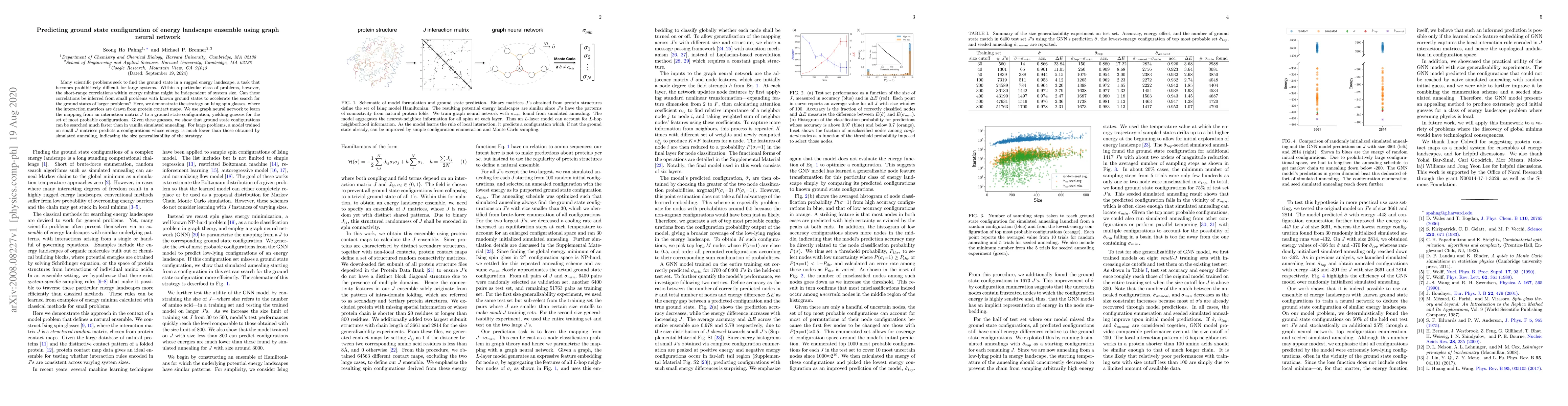 This paper proposes using graph neural networks to predict ground state configurations in energy landscapes, specifically for Ising spin glasses derived from protein contact maps. The method trains on small interaction matrices to infer short-range correlations, which then accelerates the search for ground states in larger systems, outperforming traditional simulated annealing.