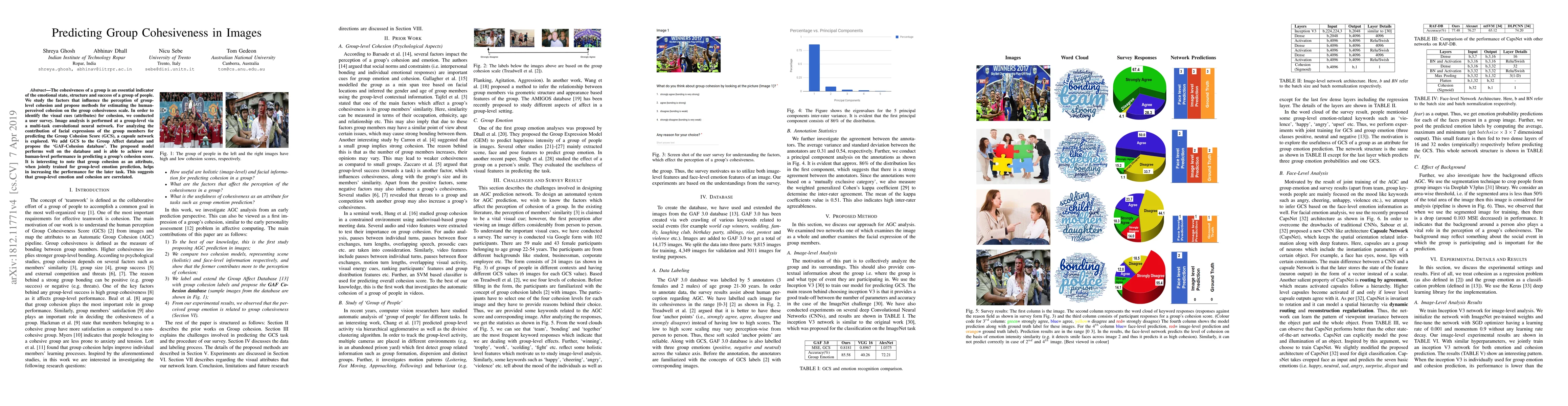 Researchers developed a model to predict group cohesion in images using convolutional neural networks and capsule networks, achieving near-human level performance. The study suggests that group-level emotion and cohesion are correlated and can improve the accuracy of later tasks.