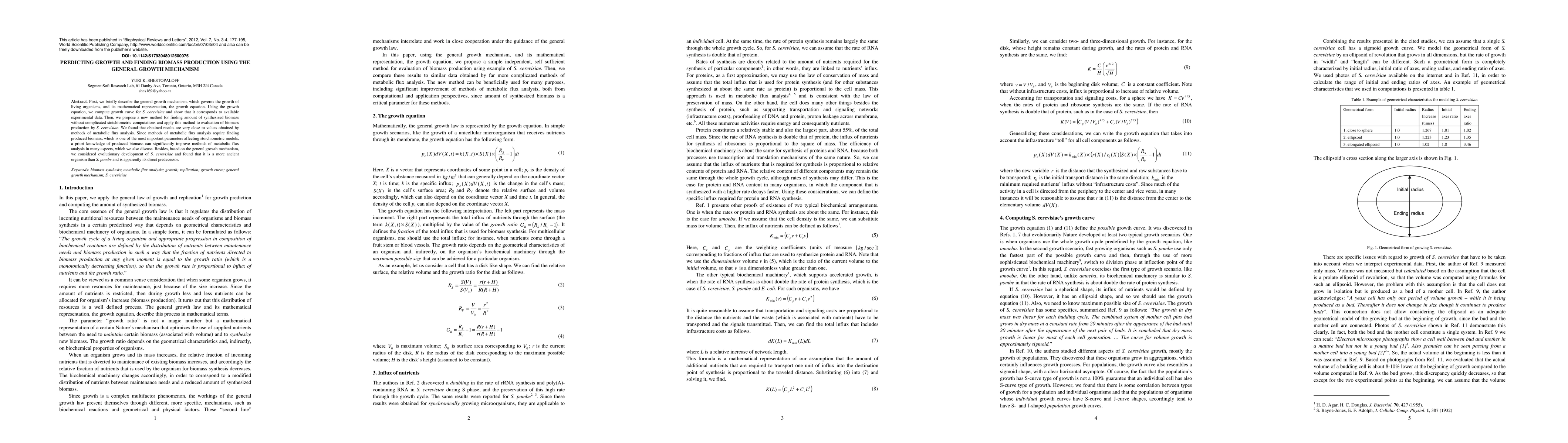 This paper proposes a new method for predicting biomass production in S. cerevisiae using the general growth mechanism, showing results close to those from metabolic flux analysis. It also suggests that S. cerevisiae is an ancient organism and a direct predecessor to S. pombe.