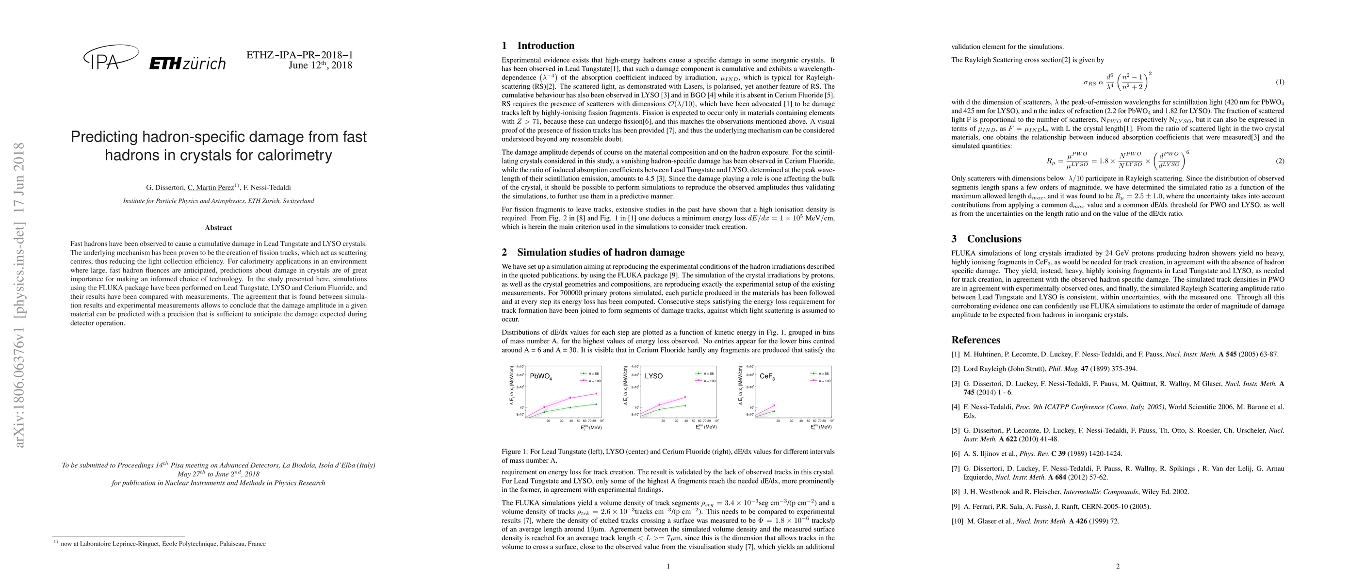 Fast hadrons have been observed to cause a cumulative damage in Lead Tungstate and LYSO crystals. The underlying mechanism has been proven to be the creation of fission tracks, which act as scattering centres, thus reducing the light collection efficiency. For calorimetry applications in an environment where large, fast hadron fluences are anticipated, predictions about damage in crystals are of great importance for making an informed choice of technology. In the study presented here, simulations using the FLUKA package have been performed on Lead Tungstate, LYSO and Cerium Fluoride, and their results have been compared with measurements. The agreement that is found between simulation results and experimental measurements allows to conclude that the damage amplitude in a given material can be predicted with a precision that is sufficient to anticipate the damage expected during detector operation.