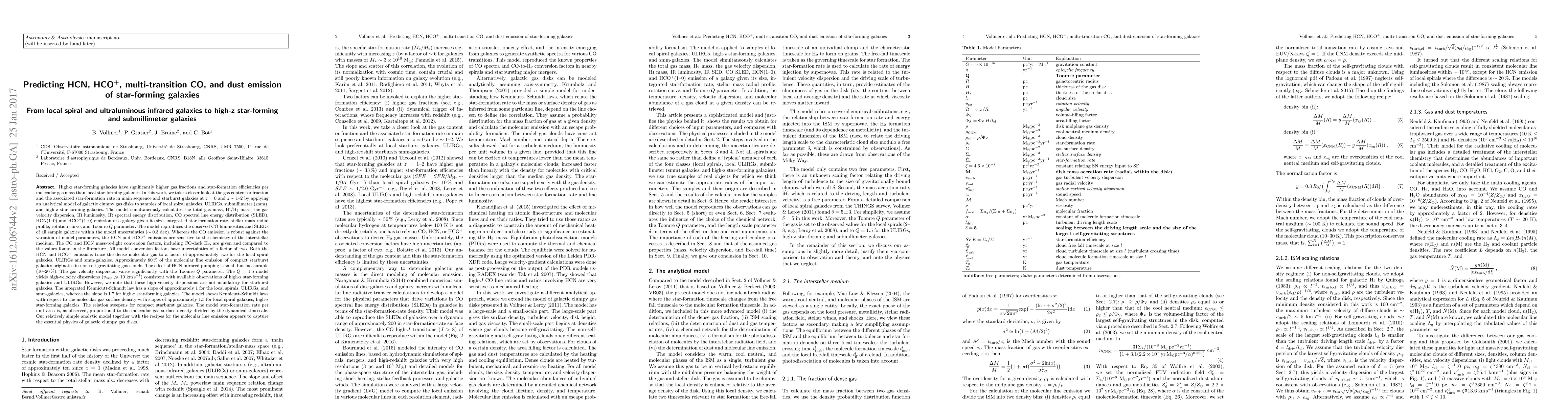 This research develops an analytical model to predict gas content, star formation rates, and molecular emission in galaxies from local spirals to high-z star-forming galaxies. The model accurately reproduces CO luminosities and spectral line energy distributions, while HCN and HCO+ emissions are sensitive to interstellar medium chemistry.