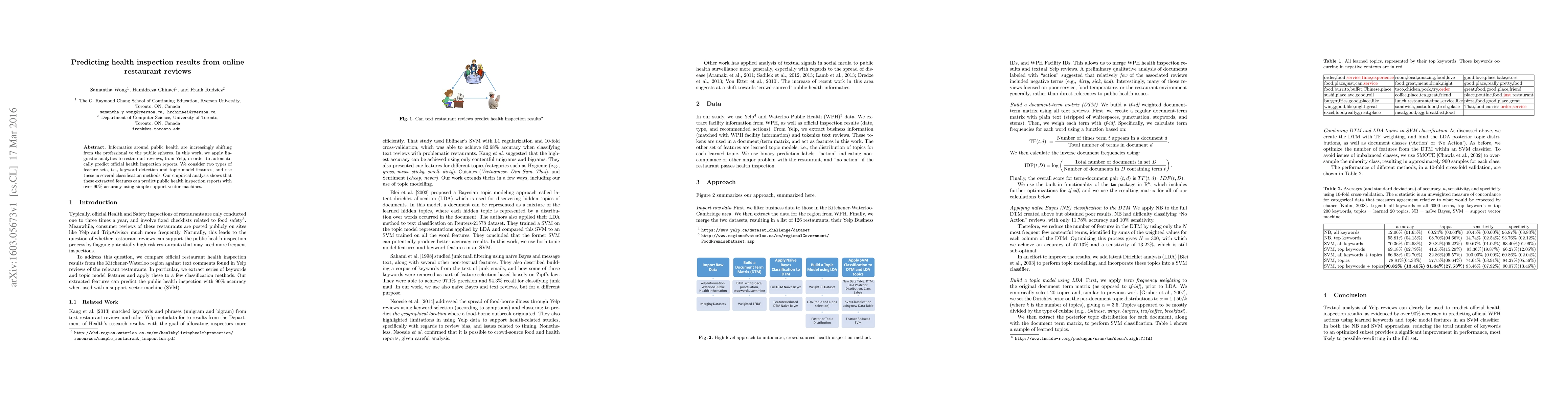 Informatics around public health are increasingly shifting from the professional to the public spheres. In this work, we apply linguistic analytics to restaurant reviews, from Yelp, in order to automatically predict official health inspection reports. We consider two types of feature sets, i.e., keyword detection and topic model features, and use these in several classification methods. Our empirical analysis shows that these extracted features can predict public health inspection reports with over 90% accuracy using simple support vector machines.