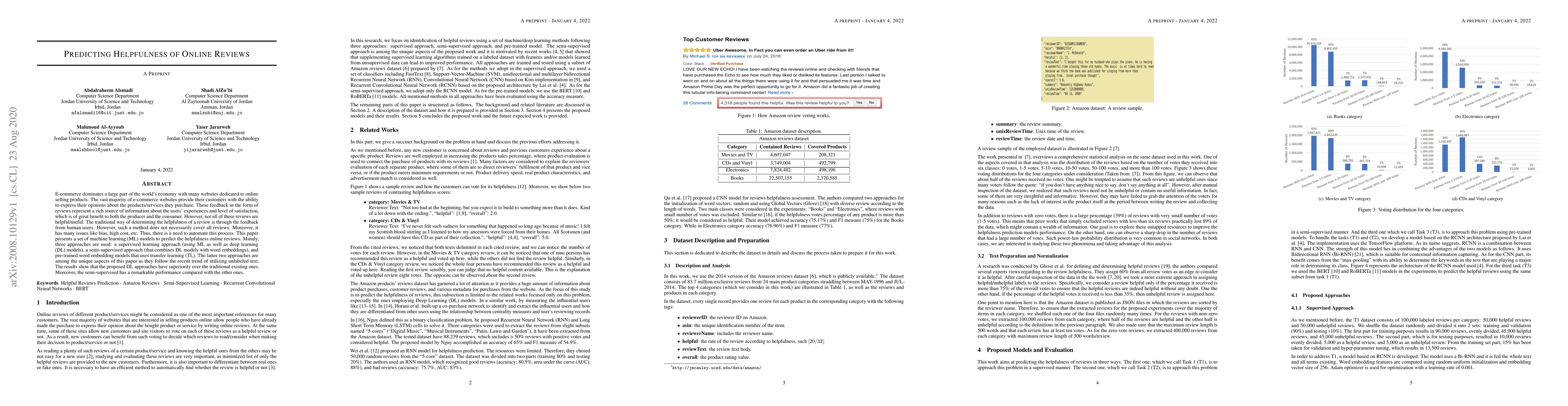 E-commerce dominates a large part of the world's economy with many websites dedicated to online selling products. The vast majority of e-commerce websites provide their customers with the ability to express their opinions about the products/services they purchase. These feedback in the form of reviews represent a rich source of information about the users' experiences and level of satisfaction, which is of great benefit to both the producer and the consumer. However, not all of these reviews are helpful/useful. The traditional way of determining the helpfulness of a review is through the feedback from human users. However, such a method does not necessarily cover all reviews. Moreover, it has many issues like bias, high cost, etc. Thus, there is a need to automate this process. This paper presents a set of machine learning (ML) models to predict the helpfulness online reviews. Mainly, three approaches are used: a supervised learning approach (using ML as well as deep learning (DL) models), a semi-supervised approach (that combines DL models with word embeddings), and pre-trained word embedding models that uses transfer learning (TL). The latter two approaches are among the unique aspects of this paper as they follow the recent trend of utilizing unlabeled text. The results show that the proposed DL approaches have superiority over the traditional existing ones. Moreover, the semi-supervised has a remarkable performance compared with the other ones.