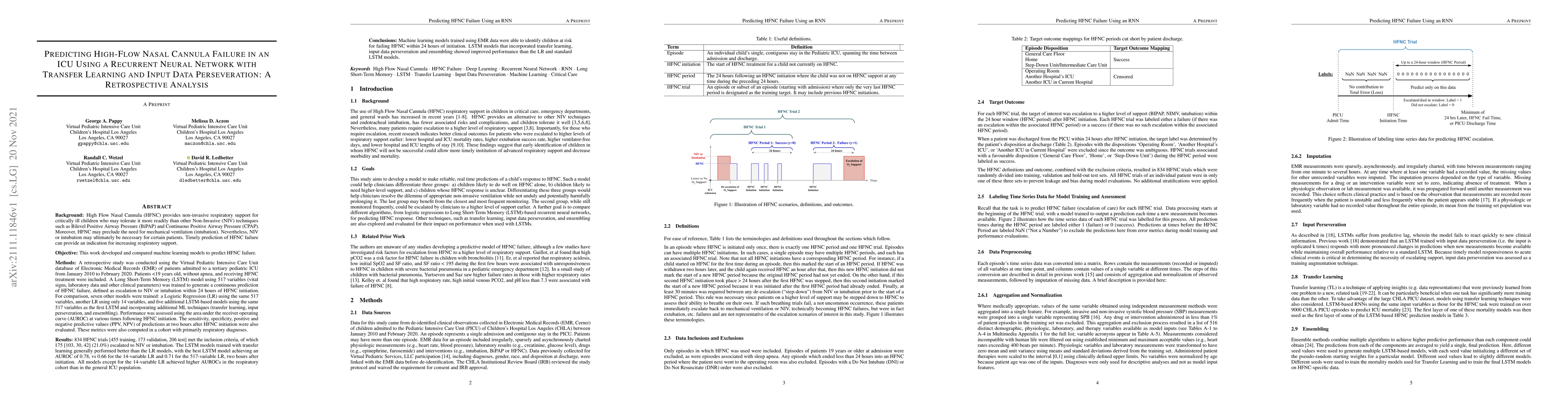 High Flow Nasal Cannula (HFNC) provides non-invasive respiratory support for critically ill children who may tolerate it more readily than other Non-Invasive (NIV) techniques. Timely prediction of HFNC failure can provide an indication for increasing respiratory support. This work developed and compared machine learning models to predict HFNC failure. A retrospective study was conducted using EMR of patients admitted to a tertiary pediatric ICU from January 2010 to February 2020. A Long Short-Term Memory (LSTM) model was trained to generate a continuous prediction of HFNC failure. Performance was assessed using the area under the receiver operating curve (AUROC) at various times following HFNC initiation. The sensitivity, specificity, positive and negative predictive values (PPV, NPV) of predictions at two hours after HFNC initiation were also evaluated. These metrics were also computed in a cohort with primarily respiratory diagnoses. 834 HFNC trials [455 training, 173 validation, 206 test] met the inclusion criteria, of which 175 [103, 30, 42] (21.0%) escalated to NIV or intubation. The LSTM models trained with transfer learning generally performed better than the LR models, with the best LSTM model achieving an AUROC of 0.78, vs 0.66 for the LR, two hours after initiation. Machine learning models trained using EMR data were able to identify children at risk for failing HFNC within 24 hours of initiation. LSTM models that incorporated transfer learning, input data perseveration and ensembling showed improved performance than the LR and standard LSTM models.