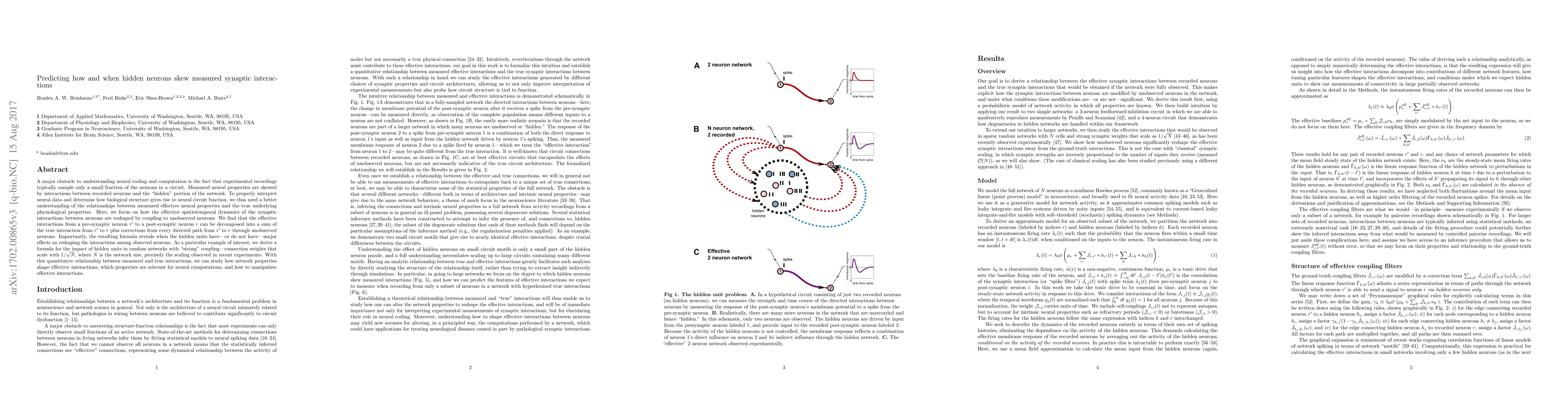 A major obstacle to understanding neural coding and computation is the fact that experimental recordings typically sample only a small fraction of the neurons in a circuit. Measured neural properties are skewed by interactions between recorded neurons and the "hidden" portion of the network. To properly interpret neural data and determine how biological structure gives rise to neural circuit function, we thus need a better understanding of the relationships between measured effective neural properties and the true underlying physiological properties. Here, we focus on how the effective spatiotemporal dynamics of the synaptic interactions between neurons are reshaped by coupling to unobserved neurons. We find that the effective interactions from a pre-synaptic neuron $r'$ to a post-synaptic neuron $r$ can be decomposed into a sum of the true interaction from $r'$ to $r$ plus corrections from every directed path from $r'$ to $r$ through unobserved neurons. Importantly, the resulting formula reveals when the hidden units have---or do not have---major effects on reshaping the interactions among observed neurons. As a particular example of interest, we derive a formula for the impact of hidden units in random networks with "strong" coupling---connection weights that scale with $1/\sqrt{N}$, where $N$ is the network size, precisely the scaling observed in recent experiments. With this quantitative relationship between measured and true interactions, we can study how network properties shape effective interactions, which properties are relevant for neural computations, and how to manipulate effective interactions.
