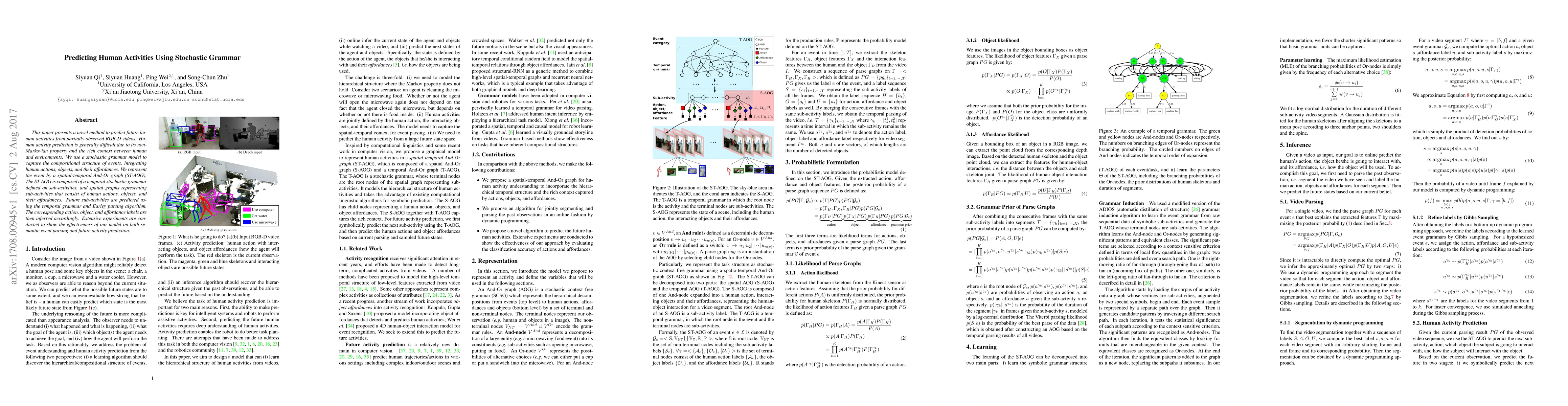 This paper introduces a stochastic grammar model to predict human activities from RGB-D videos, using a spatial-temporal And-Or graph to capture the compositional structure of events. The method employs temporal grammar and Earley parsing for future activity prediction, demonstrating effectiveness in semantic event parsing and activity forecasting.
