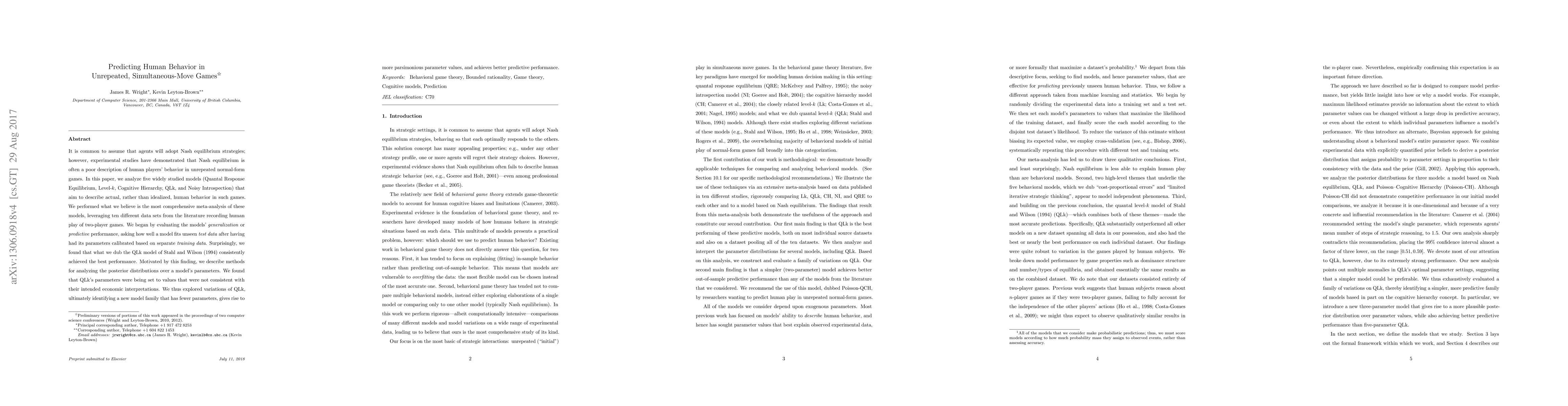 It is common to assume that agents will adopt Nash equilibrium strategies; however, experimental studies have demonstrated that Nash equilibrium is often a poor description of human players' behavior in unrepeated normal-form games. In this paper, we analyze five widely studied models (Quantal Response Equilibrium, Level-k, Cognitive Hierarchy, QLk, and Noisy Introspection) that aim to describe actual, rather than idealized, human behavior in such games. We performed what we believe is the most comprehensive meta-analysis of these models, leveraging ten different data sets from the literature recording human play of two-player games. We began by evaluating the models' generalization or predictive performance, asking how well a model fits unseen test data after having had its parameters calibrated based on separate training data. Surprisingly, we found that what we dub the QLk model of Stahl & Wilson (1994) consistently achieved the best performance. Motivated by this finding, we describe methods for analyzing the posterior distributions over a model's parameters. We found that QLk's parameters were being set to values that were not consistent with their intended economic interpretations. We thus explored variations of QLk, ultimately identifying a new model family that has fewer parameters, gives rise to more parsimonious parameter values, and achieves better predictive performance.