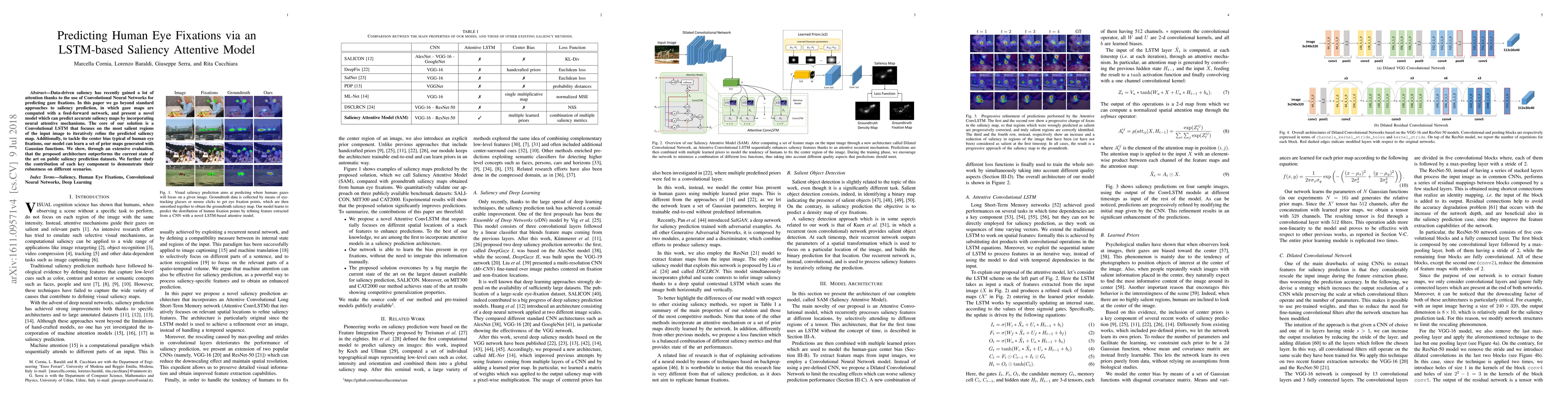 This paper introduces a novel LSTM-based saliency attentive model that leverages Convolutional LSTMs to iteratively refine saliency maps and incorporates neural attentive mechanisms for more accurate predictions. The model also addresses center bias through Gaussian-generated prior maps, outperforming current state-of-the-art methods on saliency prediction datasets.