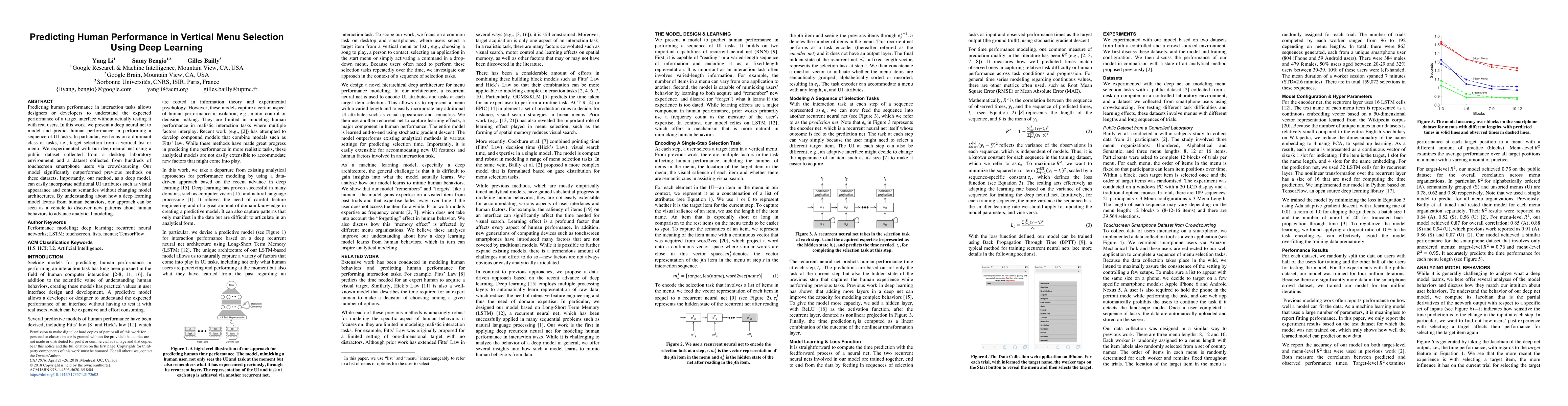This paper presents a deep neural network to predict human performance in vertical menu selection tasks, outperforming previous methods. The model can incorporate additional UI attributes and offers insights into human behavior patterns for advanced analytical modeling.