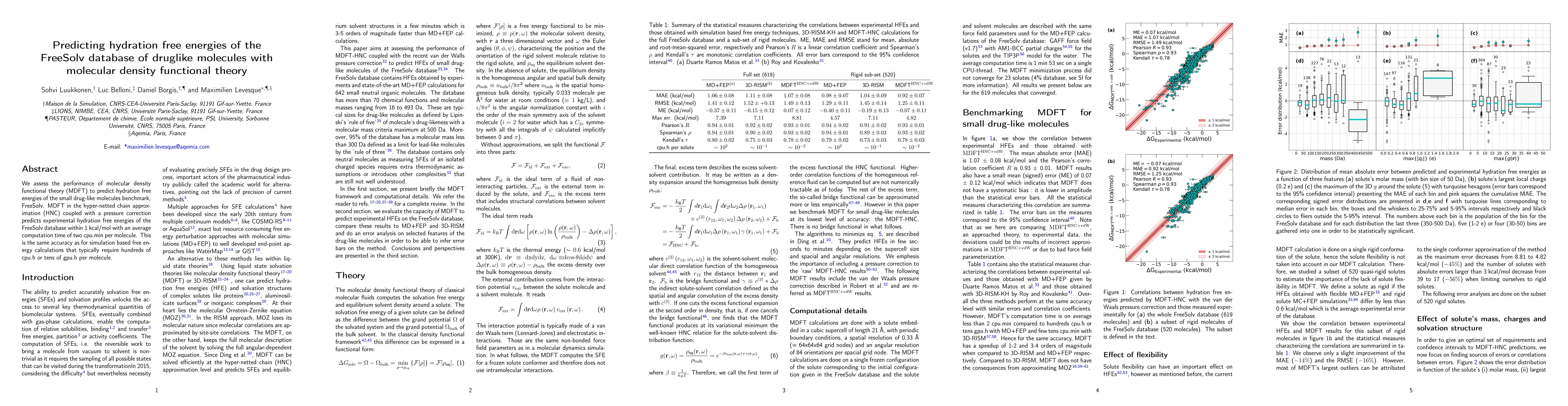 We assess the performance of molecular densityfunctional theory (MDFT) to predict hydration freeenergies of the small drug-like molecules benchmark,FreeSolv. MDFT in the hyper-netted chain approx-imation (HNC) coupled with a pressure correctionpredicts experimental hydration free energies of theFreeSolv database within 1 kcal/mol with an averagecomputation time of two cpu.min per molecule. Thisis the same accuracy as for simulation based free en-ergy calculations that typically require hundreds ofcpu.h or tens of gpu.h per molecule.