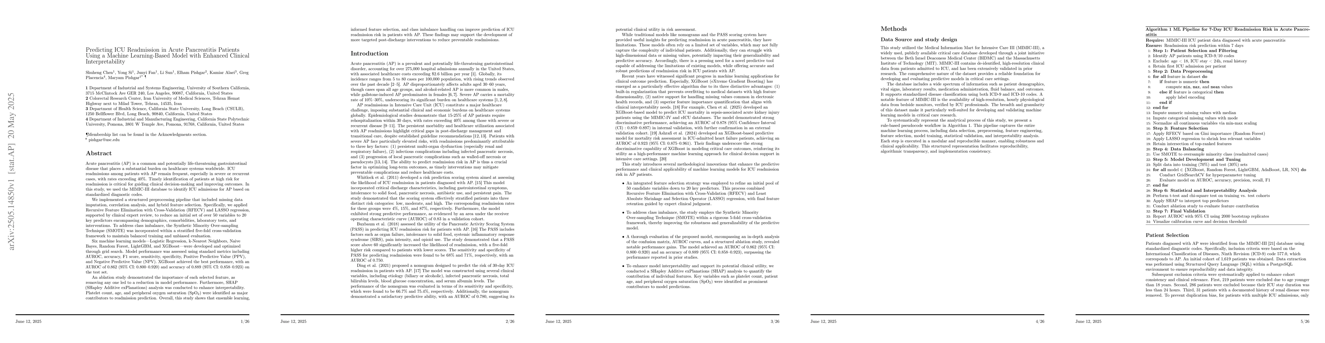 The paper presents a machine learning-based model with enhanced clinical interpretability for predicting ICU readmission in acute pancreatitis patients, incorporating techniques such as feature selection, handling class imbalance, and model evaluation.