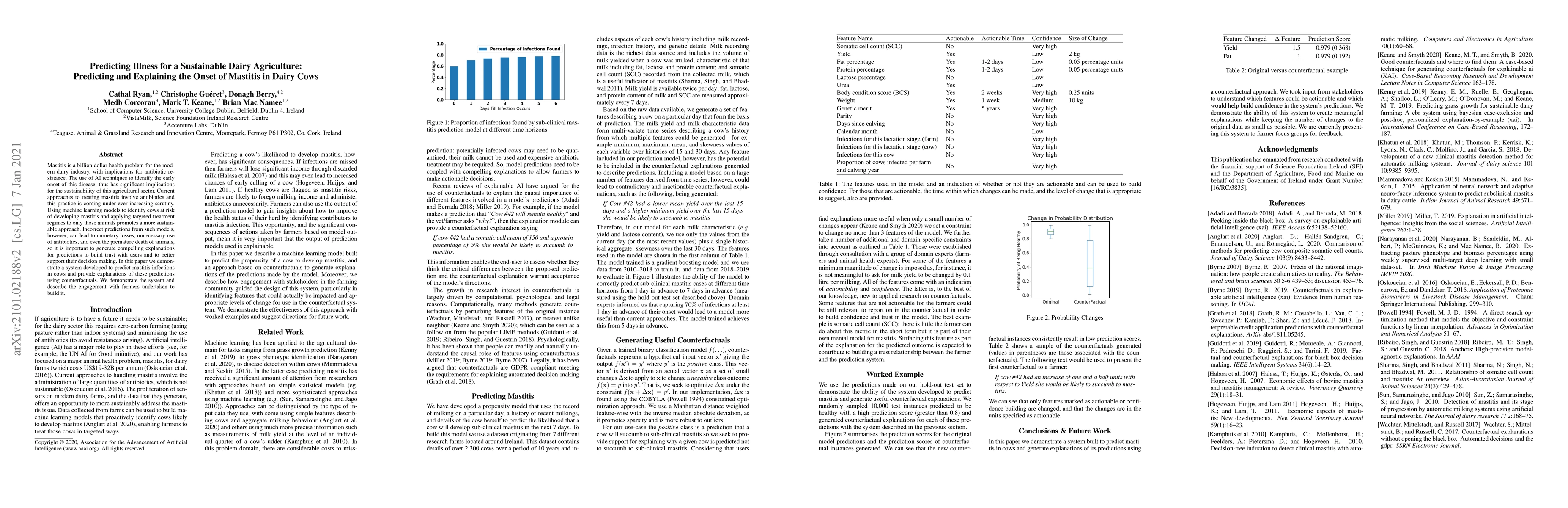 Mastitis is a billion dollar health problem for the modern dairy industry, with implications for antibiotic resistance. The use of AI techniques to identify the early onset of this disease, thus has significant implications for the sustainability of this agricultural sector. Current approaches to treating mastitis involve antibiotics and this practice is coming under ever increasing scrutiny. Using machine learning models to identify cows at risk of developing mastitis and applying targeted treatment regimes to only those animals promotes a more sustainable approach. Incorrect predictions from such models, however, can lead to monetary losses, unnecessary use of antibiotics, and even the premature death of animals, so it is important to generate compelling explanations for predictions to build trust with users and to better support their decision making. In this paper we demonstrate a system developed to predict mastitis infections in cows and provide explanations of these predictions using counterfactuals. We demonstrate the system and describe the engagement with farmers undertaken to build it.