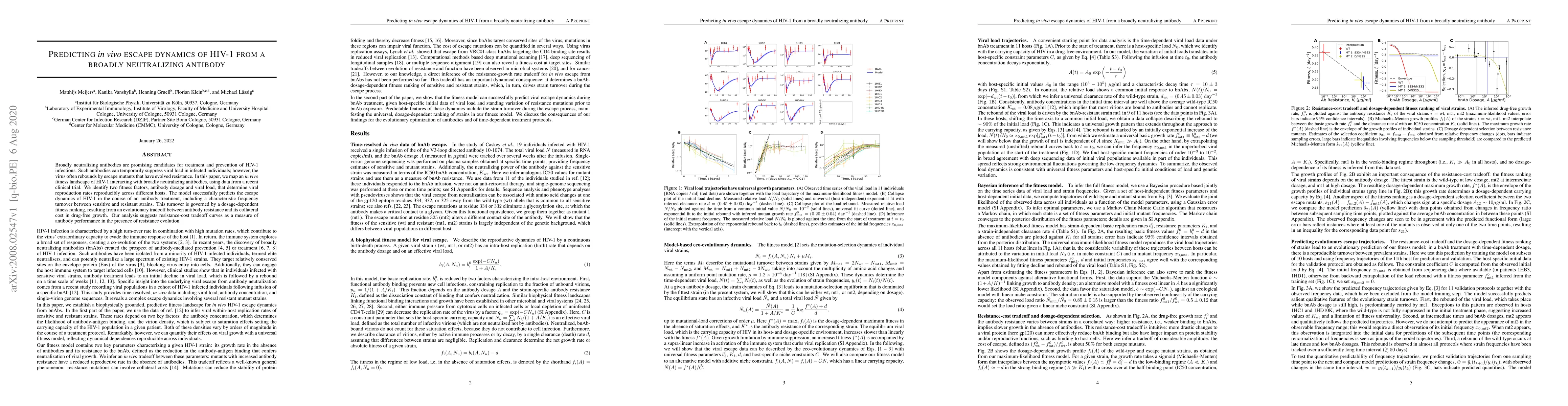 This paper develops a predictive model to map the in vivo fitness landscape of HIV-1 under the influence of broadly neutralizing antibodies, identifying key factors like antibody dosage and viral load that determine viral reproduction rates. The model accurately predicts the dynamics of HIV-1 escape mutants, highlighting a dosage-dependent fitness ranking that governs the frequency turnover between sensitive and resistant strains.