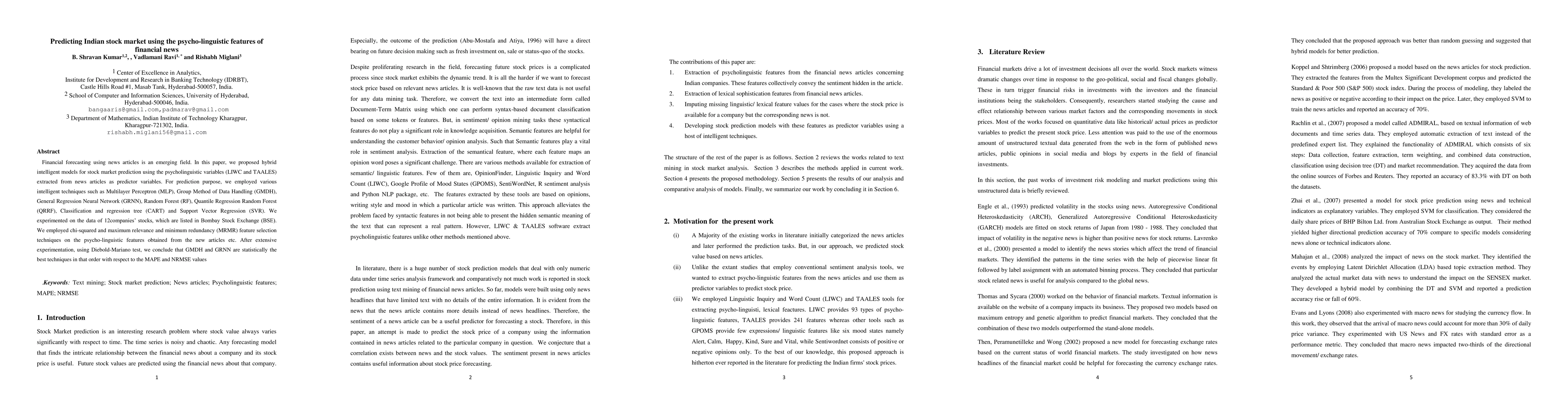 The paper introduces a novel stock market prediction model based on psycholinguistic features extracted from financial news articles, employing various intelligent techniques for regression.