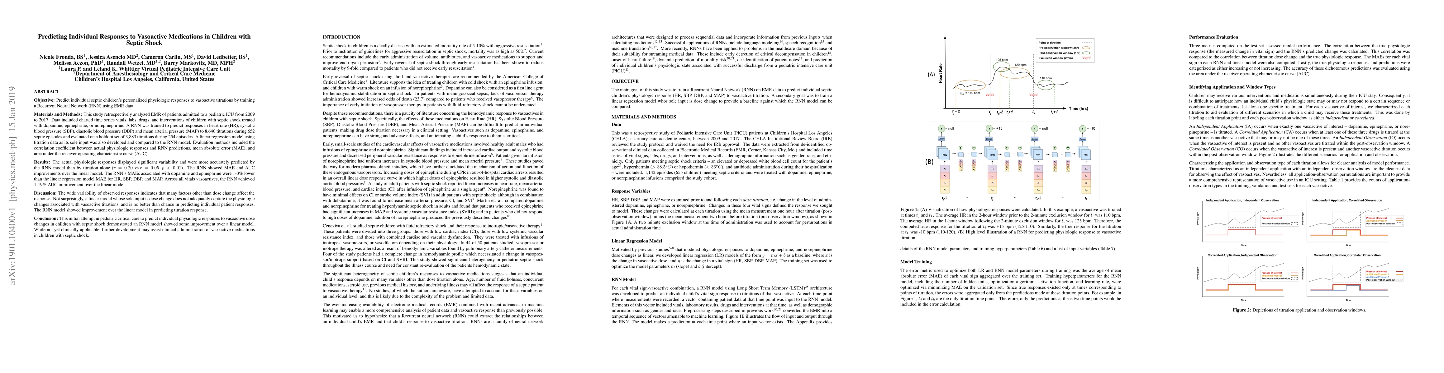 This study trains a Recurrent Neural Network (RNN) to predict individual responses to vasoactive medications in children with septic shock using electronic medical records, showing improved accuracy over a linear regression model in predicting heart rate and blood pressure changes. Further development may enhance personalized treatment strategies.