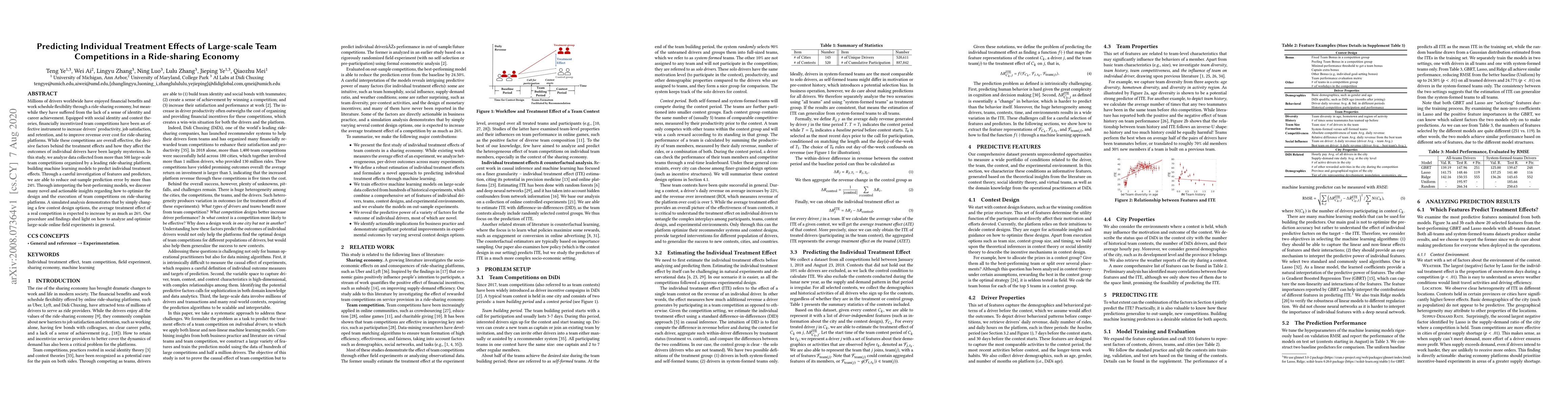 Millions of drivers worldwide have enjoyed financial benefits and work schedule flexibility through a ride-sharing economy, but meanwhile they have suffered from the lack of a sense of identity and career achievement. Equipped with social identity and contest theories, financially incentivized team competitions have been an effective instrument to increase drivers' productivity, job satisfaction, and retention, and to improve revenue over cost for ride-sharing platforms. While these competitions are overall effective, the decisive factors behind the treatment effects and how they affect the outcomes of individual drivers have been largely mysterious. In this study, we analyze data collected from more than 500 large-scale team competitions organized by a leading ride-sharing platform, building machine learning models to predict individual treatment effects. Through a careful investigation of features and predictors, we are able to reduce out-sample prediction error by more than 24%. Through interpreting the best-performing models, we discover many novel and actionable insights regarding how to optimize the design and the execution of team competitions on ride-sharing platforms. A simulated analysis demonstrates that by simply changing a few contest design options, the average treatment effect of a real competition is expected to increase by as much as 26%. Our procedure and findings shed light on how to analyze and optimize large-scale online field experiments in general.