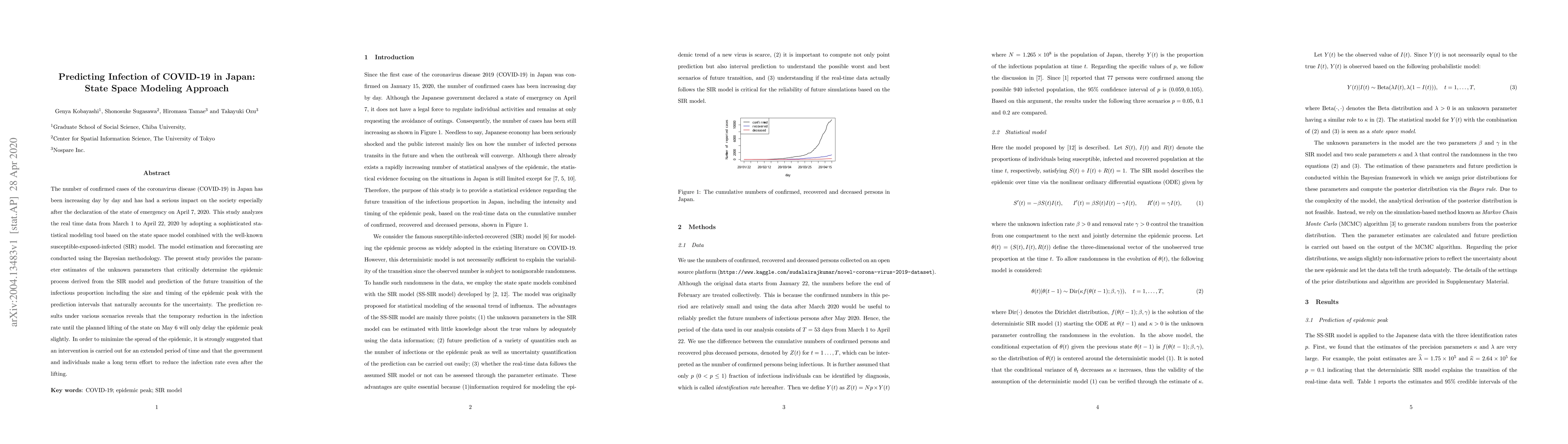 The number of confirmed cases of the coronavirus disease (COVID-19) in Japan has been increasing day by day and has had a serious impact on the society especially after the declaration of the state of emergency on April 7, 2020. This study analyzes the real time data from March 1 to April 22, 2020 by adopting a sophisticated statistical modeling tool based on the state space model combined with the well-known susceptible-exposed-infected (SIR) model. The model estimation and forecasting are conducted using the Bayesian methodology. The present study provides the parameter estimates of the unknown parameters that critically determine the epidemic process derived from the SIR model and prediction of the future transition of the infectious proportion including the size and timing of the epidemic peak with the prediction intervals that naturally accounts for the uncertainty. The prediction results under various scenarios reveals that the temporary reduction in the infection rate until the planned lifting of the state on May 6 will only delay the epidemic peak slightly. In order to minimize the spread of the epidemic, it is strongly suggested that an intervention is carried out for an extended period of time and that the government and individuals make a long term effort to reduce the infection rate even after the lifting.