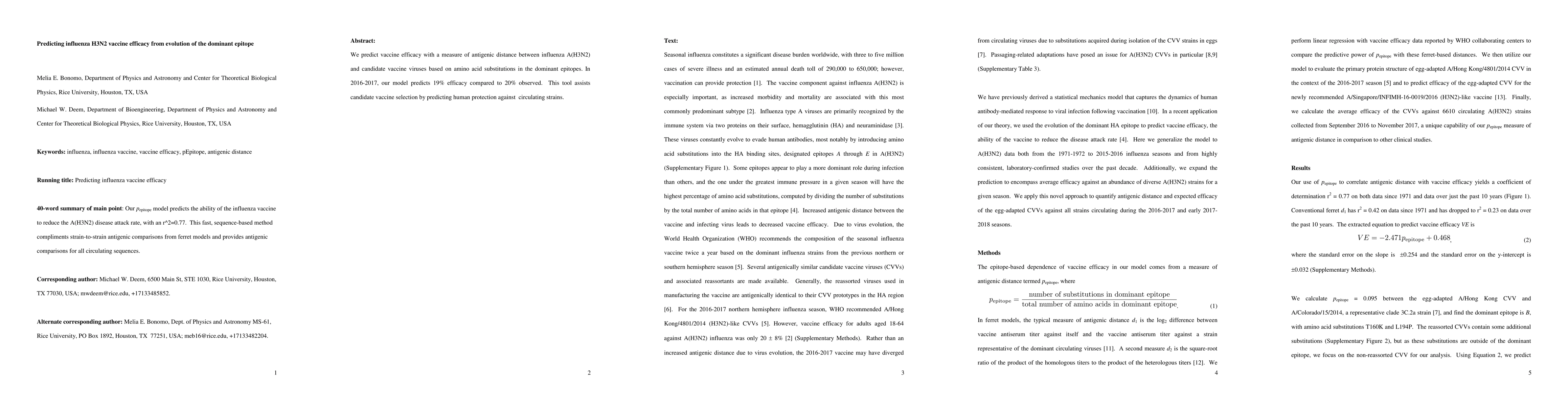 We predict vaccine efficacy with a measure of antigenic distance between influenza A(H3N2) and candidate vaccine viruses based on amino acid substitutions in the dominant epitopes. In 2016-2017, our model predicts 19% efficacy compared to 20% observed. This tool assists candidate vaccine selection by predicting human protection against circulating strains.