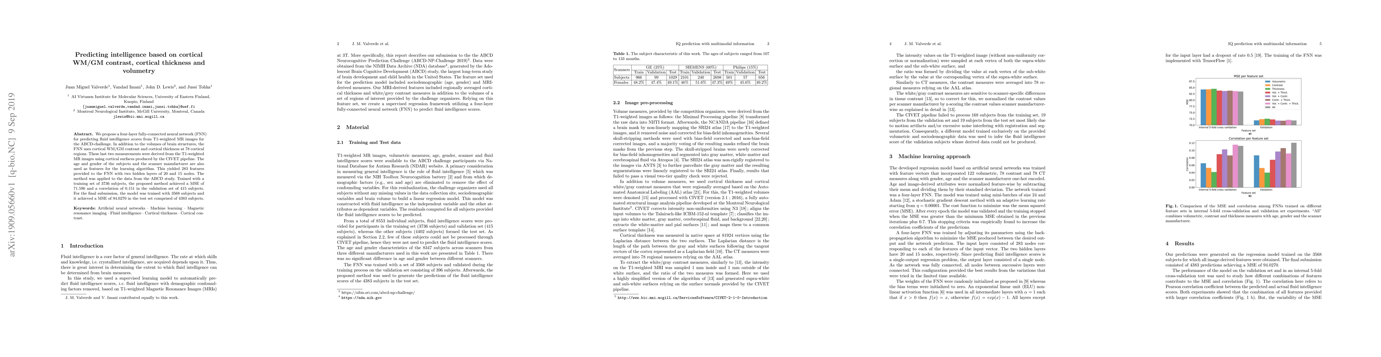 We propose a four-layer fully-connected neural network (FNN) for predicting fluid intelligence scores from T1-weighted MR images for the ABCD-challenge. In addition to the volumes of brain structures, the FNN uses cortical WM/GM contrast and cortical thickness at 78 cortical regions. These last two measurements were derived from the T1-weighted MR images using cortical surfaces produced by the CIVET pipeline. The age and gender of the subjects and the scanner manufacturer are also used as features for the learning algorithm. This yielded 283 features provided to the FNN with two hidden layers of 20 and 15 nodes. The method was applied to the data from the ABCD study. Trained with a training set of 3736 subjects, the proposed method achieved a MSE of 71.596 and a correlation of 0.151 in the validation set of 415 subjects. For the final submission, the model was trained with 3568 subjects and it achieved a MSE of 94.0270 in the test set comprised of 4383 subjects.