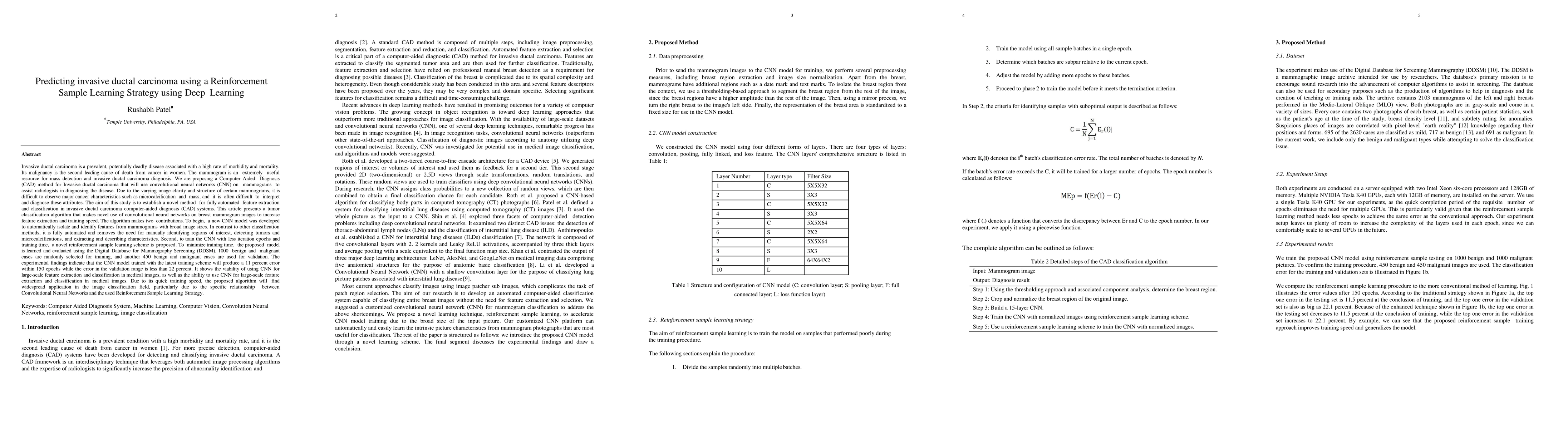 Invasive ductal carcinoma is a prevalent, potentially deadly disease associated with a high rate of morbidity and mortality. Its malignancy is the second leading cause of death from cancer in women. The mammogram is an extremely useful resource for mass detection and invasive ductal carcinoma diagnosis. We are proposing a method for Invasive ductal carcinoma that will use convolutional neural networks (CNN) on mammograms to assist radiologists in diagnosing the disease. Due to the varying image clarity and structure of certain mammograms, it is difficult to observe major cancer characteristics such as microcalcification and mass, and it is often difficult to interpret and diagnose these attributes. The aim of this study is to establish a novel method for fully automated feature extraction and classification in invasive ductal carcinoma computer-aided diagnosis (CAD) systems. This article presents a tumor classification algorithm that makes novel use of convolutional neural networks on breast mammogram images to increase feature extraction and training speed. The algorithm makes two contributions.