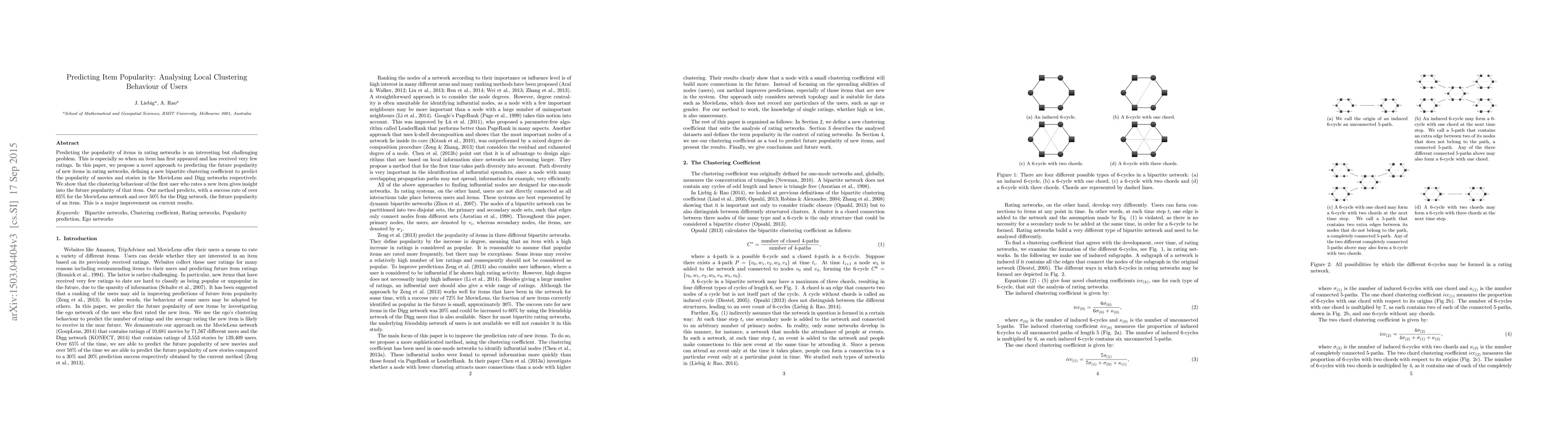 This paper introduces a new method to predict the popularity of new items in rating networks by analyzing the local clustering behavior of users. It proposes a bipartite clustering coefficient and demonstrates improved prediction accuracy, achieving over 65% success for the MovieLens network and over 50% for the Digg network.
