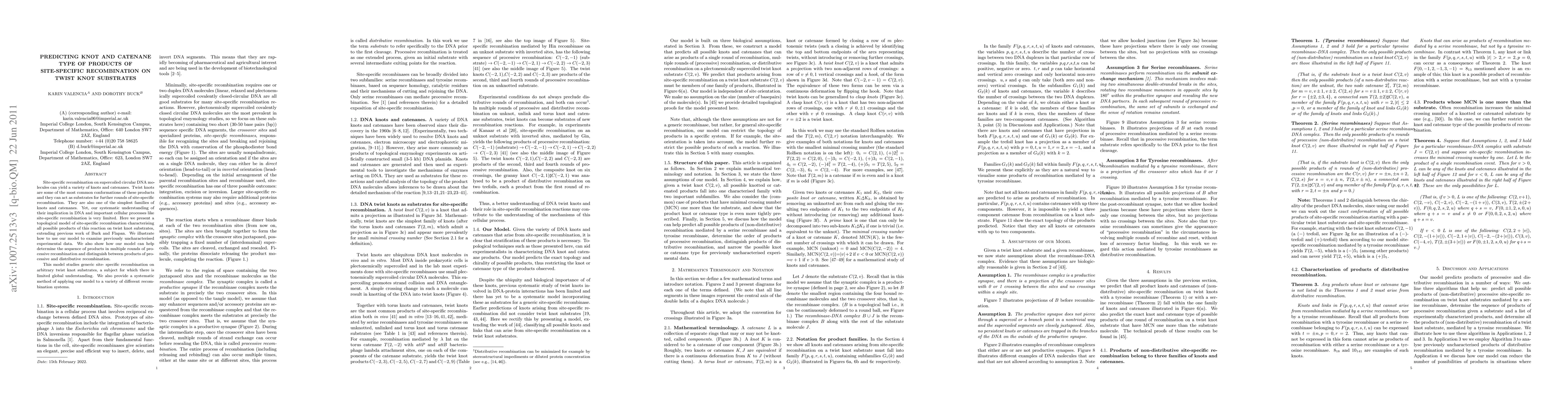 Site-specific recombination on supercoiled circular DNA molecules can yield a variety of knots and catenanes. Twist knots are some of the most common conformations of these products and they can act as substrates for further rounds of site-specific recombination. They are also one of the simplest families of knots and catenanes. Yet, our systematic understanding of their implication in DNA and important cellular processes like site-specific recombination is very limited. Here we present a topological model of site-specific recombination characterising all possible products of this reaction on twist knot substrates, extending previous work of Buck and Flapan. We illustrate how to use our model to examine previously uncharacterised experimental data. We also show how our model can help determine the sequence of products in multiple rounds of processive recombination and distinguish between products of processive and distributive recombination. This model studies generic site- specific recombination on arbitrary twist knot substrates, a subject for which there is limited global understanding. We also provide a systematic method of applying our model to a variety of different recombination systems.