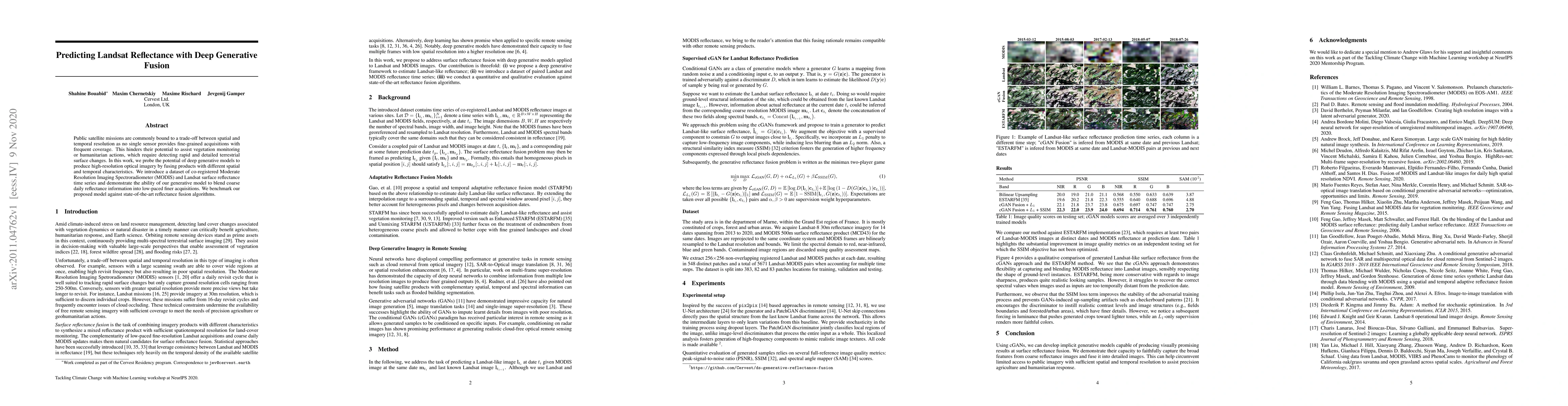 Public satellite missions are commonly bound to a trade-off between spatial and temporal resolution as no single sensor provides fine-grained acquisitions with frequent coverage. This hinders their potential to assist vegetation monitoring or humanitarian actions, which require detecting rapid and detailed terrestrial surface changes. In this work, we probe the potential of deep generative models to produce high-resolution optical imagery by fusing products with different spatial and temporal characteristics. We introduce a dataset of co-registered Moderate Resolution Imaging Spectroradiometer (MODIS) and Landsat surface reflectance time series and demonstrate the ability of our generative model to blend coarse daily reflectance information into low-paced finer acquisitions. We benchmark our proposed model against state-of-the-art reflectance fusion algorithms.