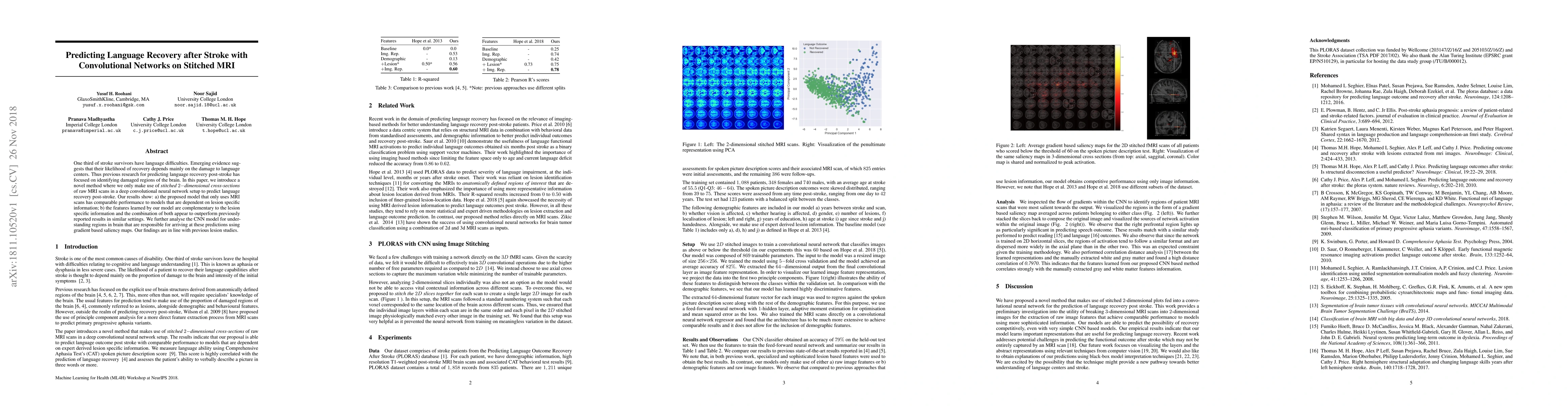 One third of stroke survivors have language difficulties. Emerging evidence suggests that their likelihood of recovery depends mainly on the damage to language centers. Thus previous research for predicting language recovery post-stroke has focused on identifying damaged regions of the brain. In this paper, we introduce a novel method where we only make use of stitched 2-dimensional cross-sections of raw MRI scans in a deep convolutional neural network setup to predict language recovery post-stroke. Our results show: a) the proposed model that only uses MRI scans has comparable performance to models that are dependent on lesion specific information; b) the features learned by our model are complementary to the lesion specific information and the combination of both appear to outperform previously reported results in similar settings. We further analyse the CNN model for understanding regions in brain that are responsible for arriving at these predictions using gradient based saliency maps. Our findings are in line with previous lesion studies.