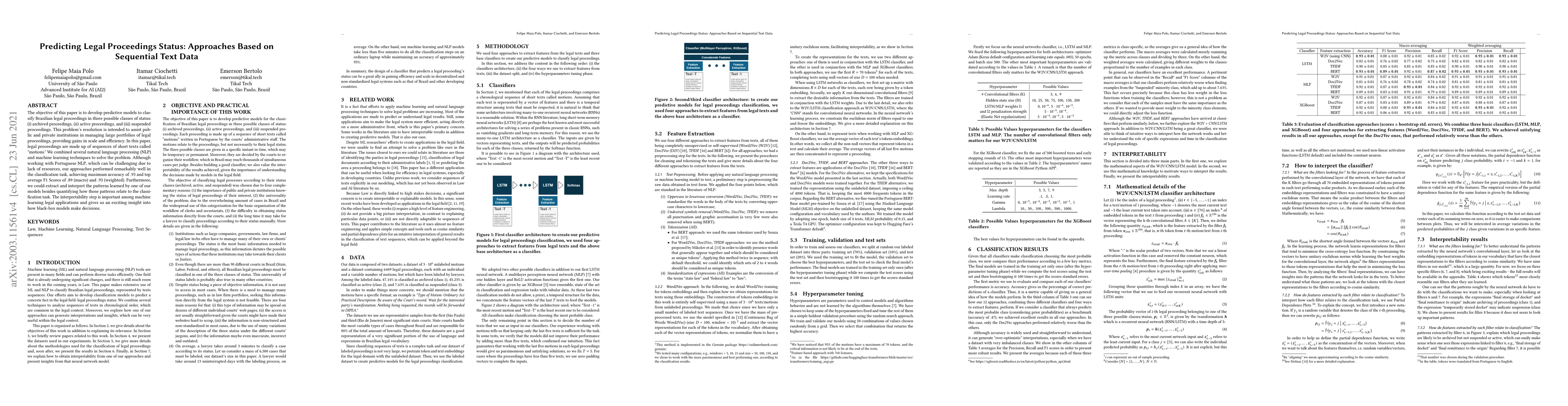 The objective of this paper is to develop predictive models to classify Brazilian legal proceedings in three possible classes of status: (i) archived proceedings, (ii) active proceedings, and (iii) suspended proceedings. This problem's resolution is intended to assist public and private institutions in managing large portfolios of legal proceedings, providing gains in scale and efficiency. In this paper, legal proceedings are made up of sequences of short texts called "motions." We combined several natural language processing (NLP) and machine learning techniques to solve the problem. Although working with Portuguese NLP, which can be challenging due to lack of resources, our approaches performed remarkably well in the classification task, achieving maximum accuracy of .93 and top average F1 Scores of .89 (macro) and .93 (weighted). Furthermore, we could extract and interpret the patterns learned by one of our models besides quantifying how those patterns relate to the classification task. The interpretability step is important among machine learning legal applications and gives us an exciting insight into how black-box models make decisions.