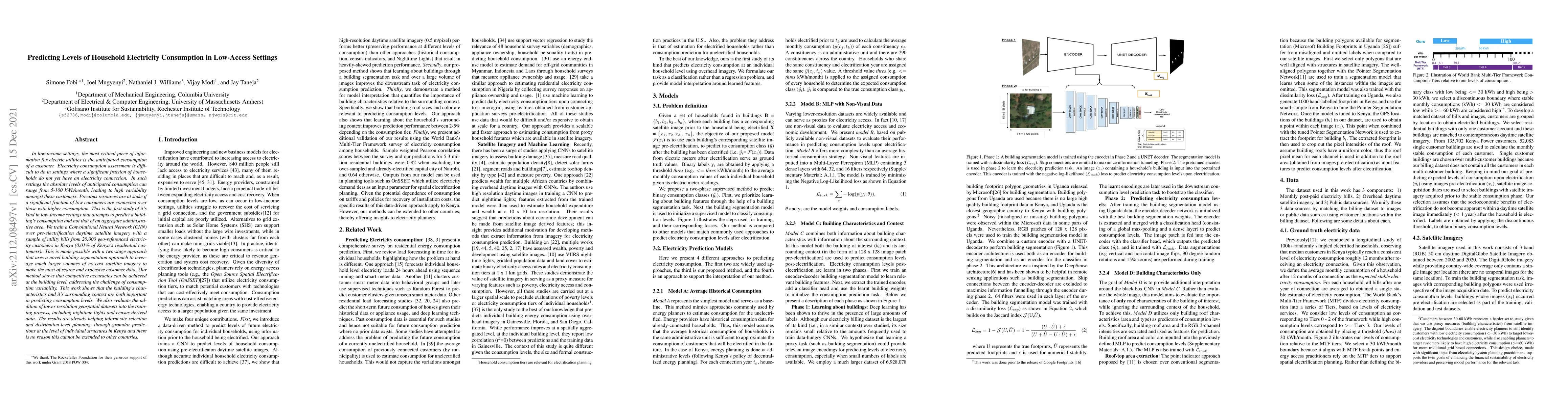 This study develops a Convolutional Neural Network (CNN) to predict household electricity consumption levels in low-access settings using pre-electrification satellite imagery and utility bills from 20,000 Kenyan customers. The approach leverages building segmentation and lower resolution geospatial data to achieve competitive accuracy for individual building predictions.
